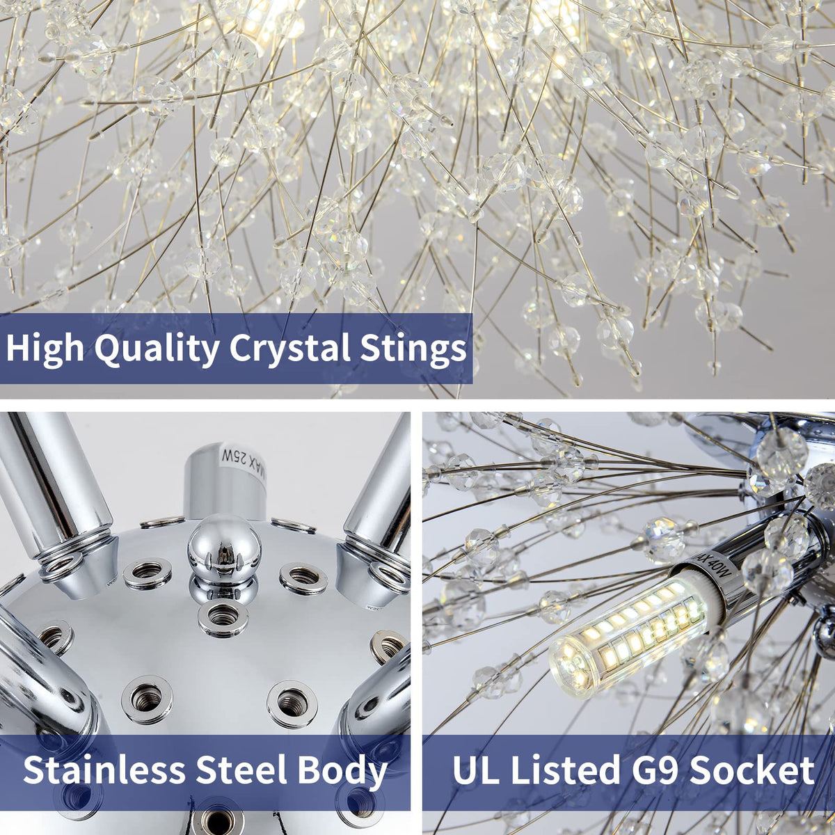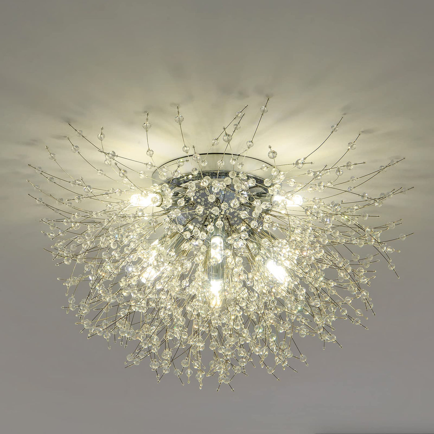 Q: What materials are used in the construction of this ceiling light?A: The Sputnik Flush Mount Ceiling Light is made from high-quality materials, including a durable metal body with a chrome finish and premium K9 crystal beads, ensuring both elegance and longevity.