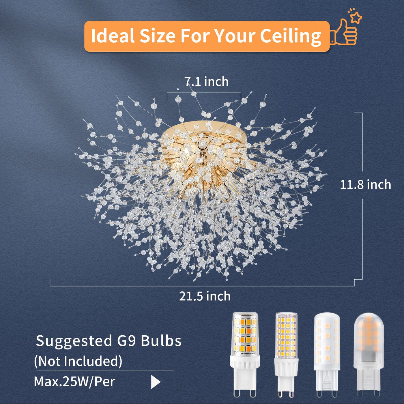 Q: What are the dimensions of the light fixture?A: The dimensions of the Sputnik Flush Mount Ceiling Light are 21.5 inches in width and 11.8 inches in height, making it an ideal choice for low-ceiling spaces while providing ample ambient lighting.
