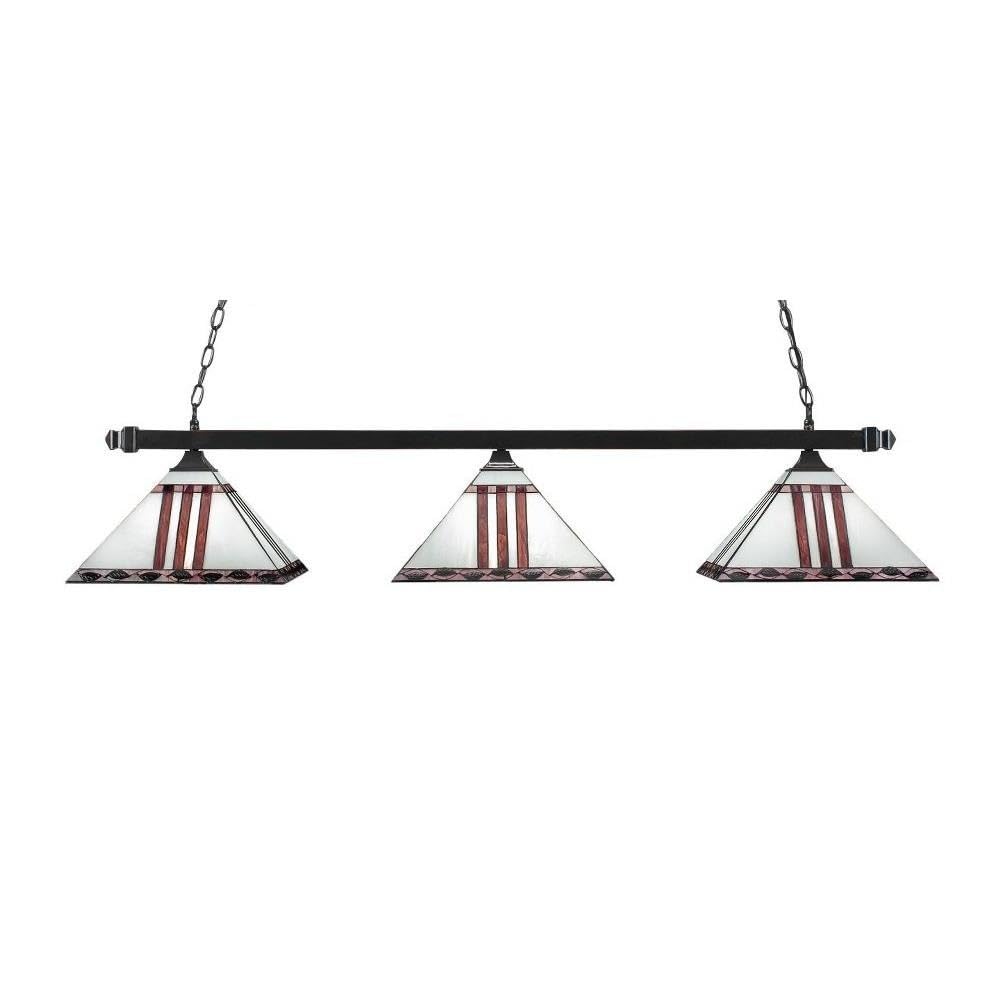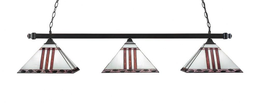 Q: What design style does the Square 3 Light Island complement?A: The Square 3 Light Island features a modern design with a brushed nickel finish and purple/metal leaf art glass, making it a stylish addition to contemporary and industrial-themed spaces.