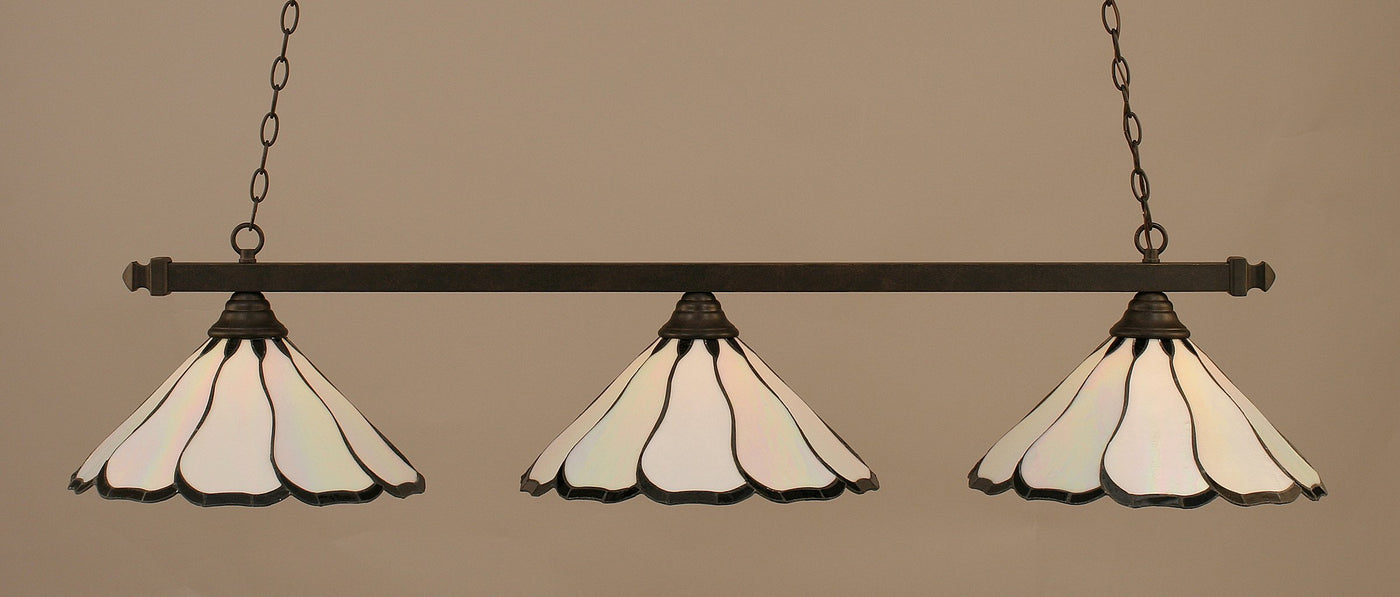 Q: What materials are used in the construction of this light fixture?A: The Square 3 Light Island features a glass shade with a unique 16-inch Pearl Flair Art Glass design, set in a stylish dark granite finish that enhances its aesthetic appeal.