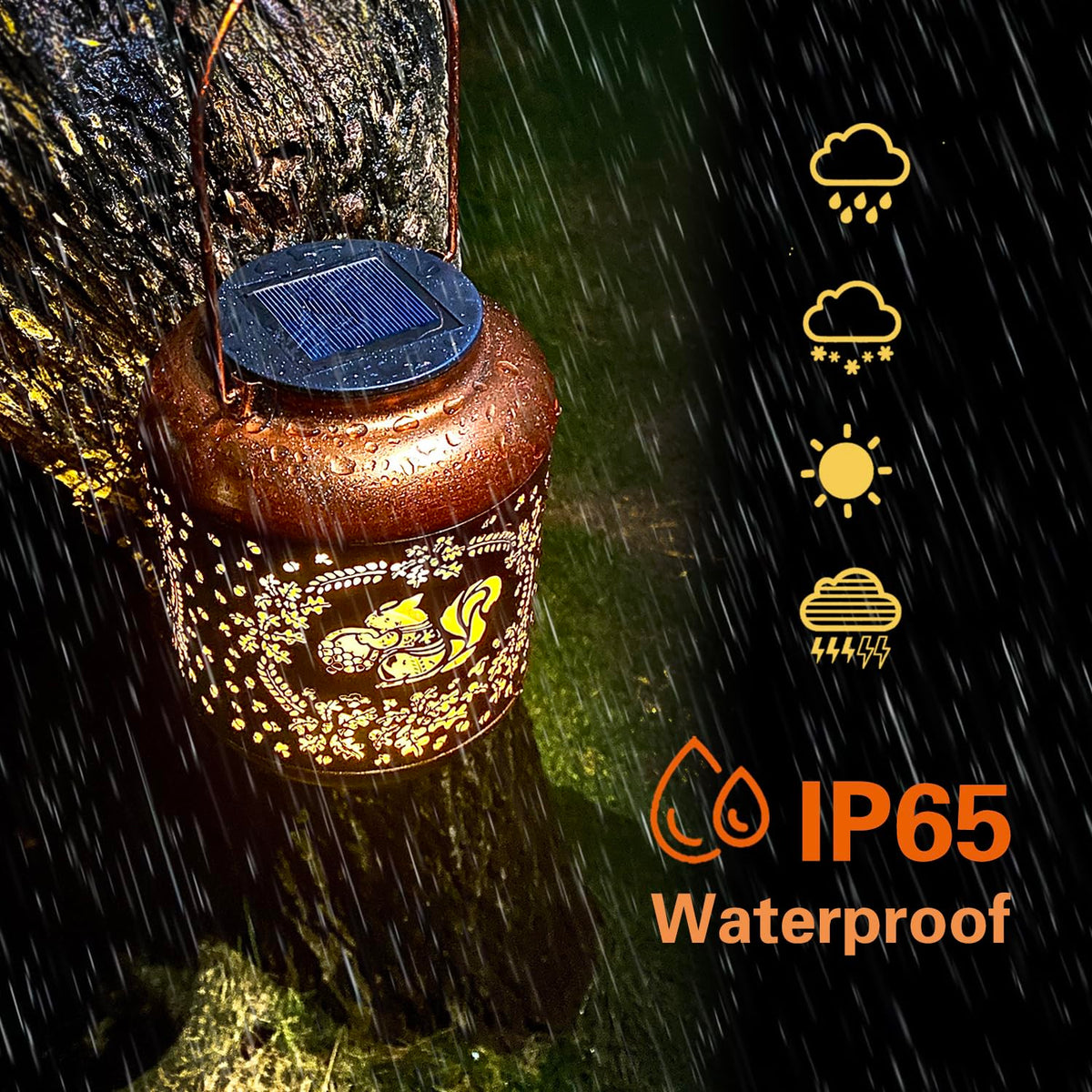 Q: Is the TIGGSY Squirrel Lantern waterproof?A: Yes, the TIGGSY Squirrel Lantern has an IP65 waterproof rating, ensuring it can withstand rain, snow, and other harsh weather conditions, making it suitable for outdoor use.
