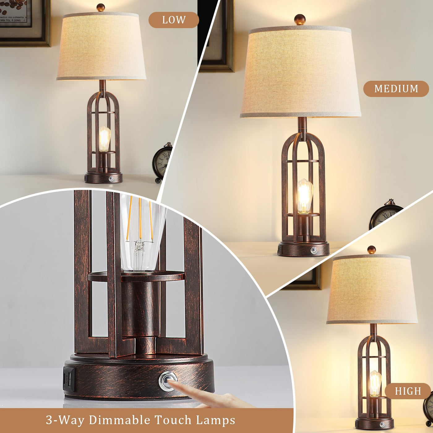 Srjja Farmhouse Table Lamps For Living Room Set Of 2, Industrial 3-Way Dimmable Touch Bedside Lamps With Usb A+C For Nightstand