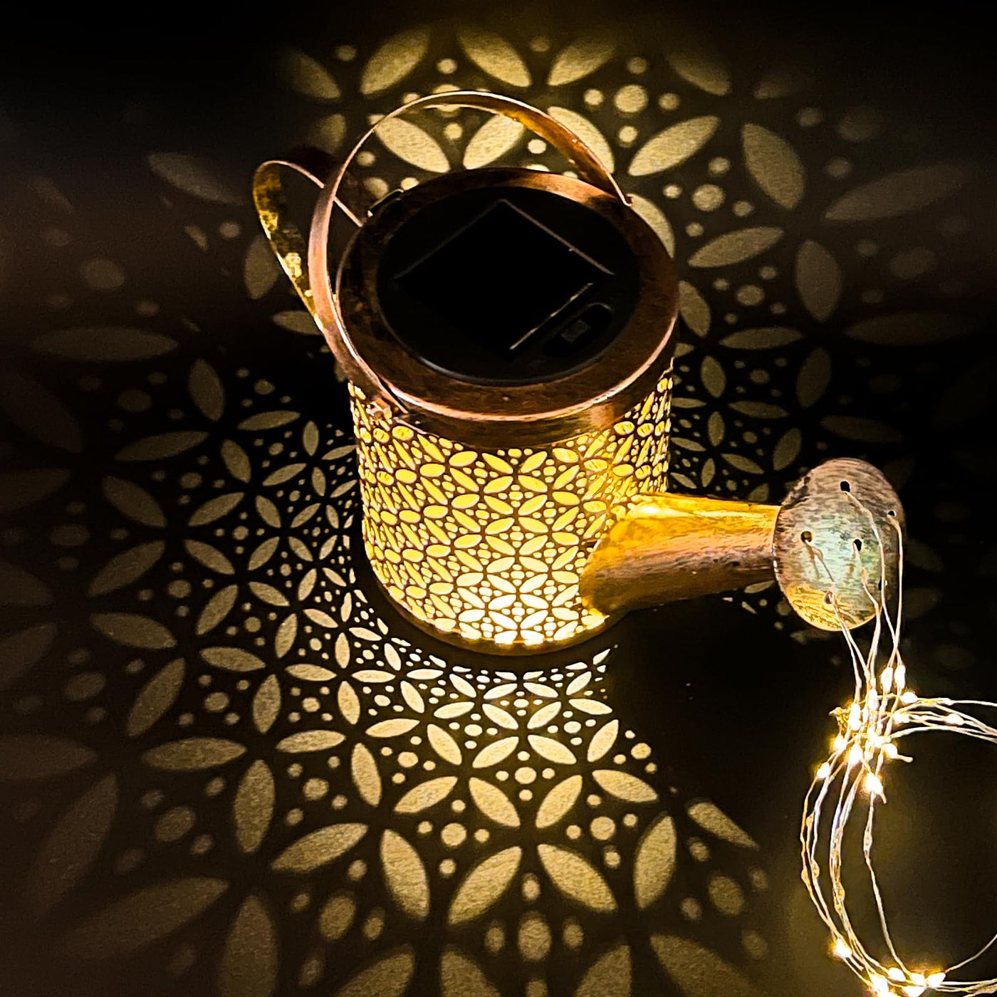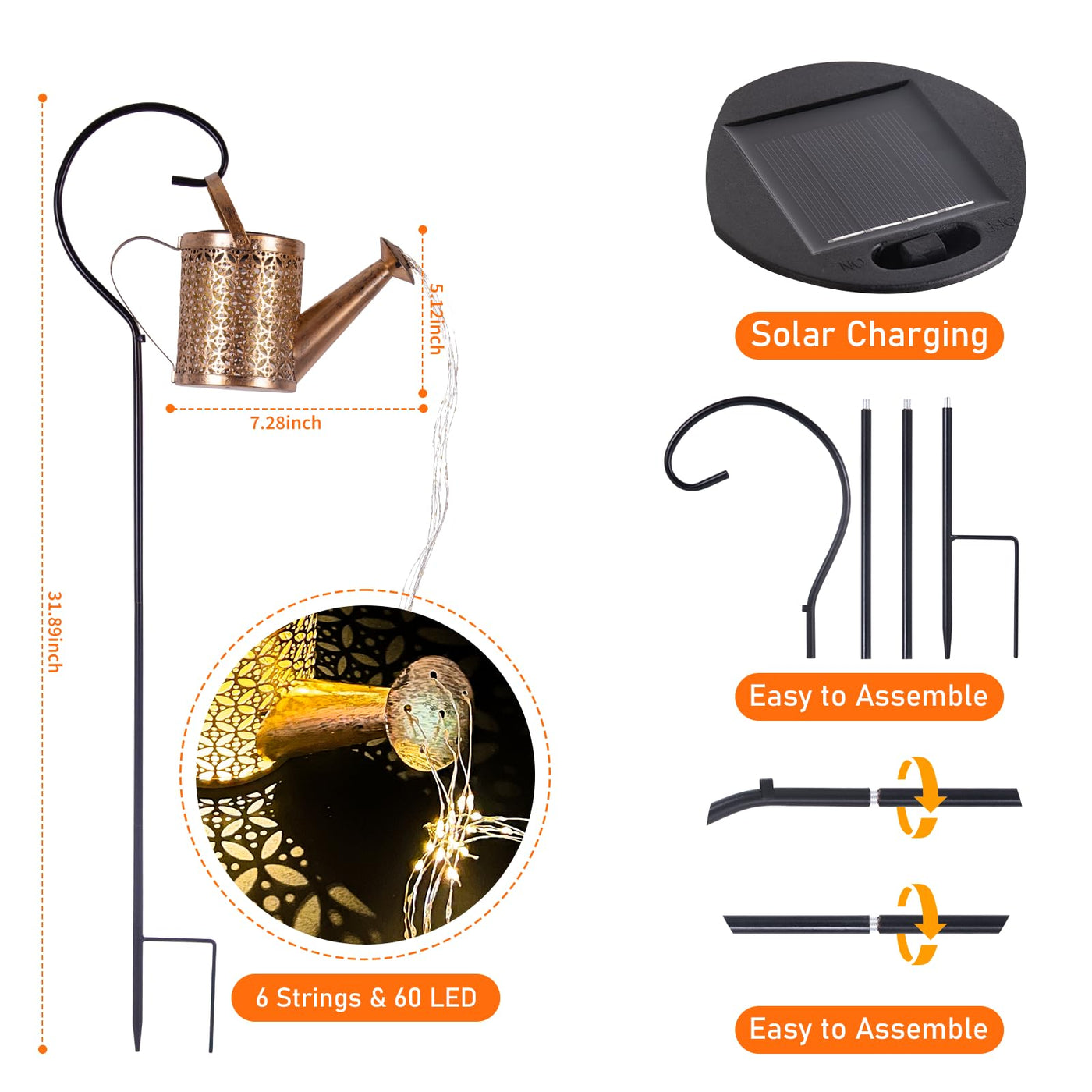 Q: What makes this solar watering can light a unique garden decoration?A: The solar watering can light features a creative hollow watering can design, complemented by flexible LED string lights that can be shaped as desired. When illuminated, the twinkling lights mimic the effect of water sprinkling, adding a magical ambiance to your garden, patio, or porch.