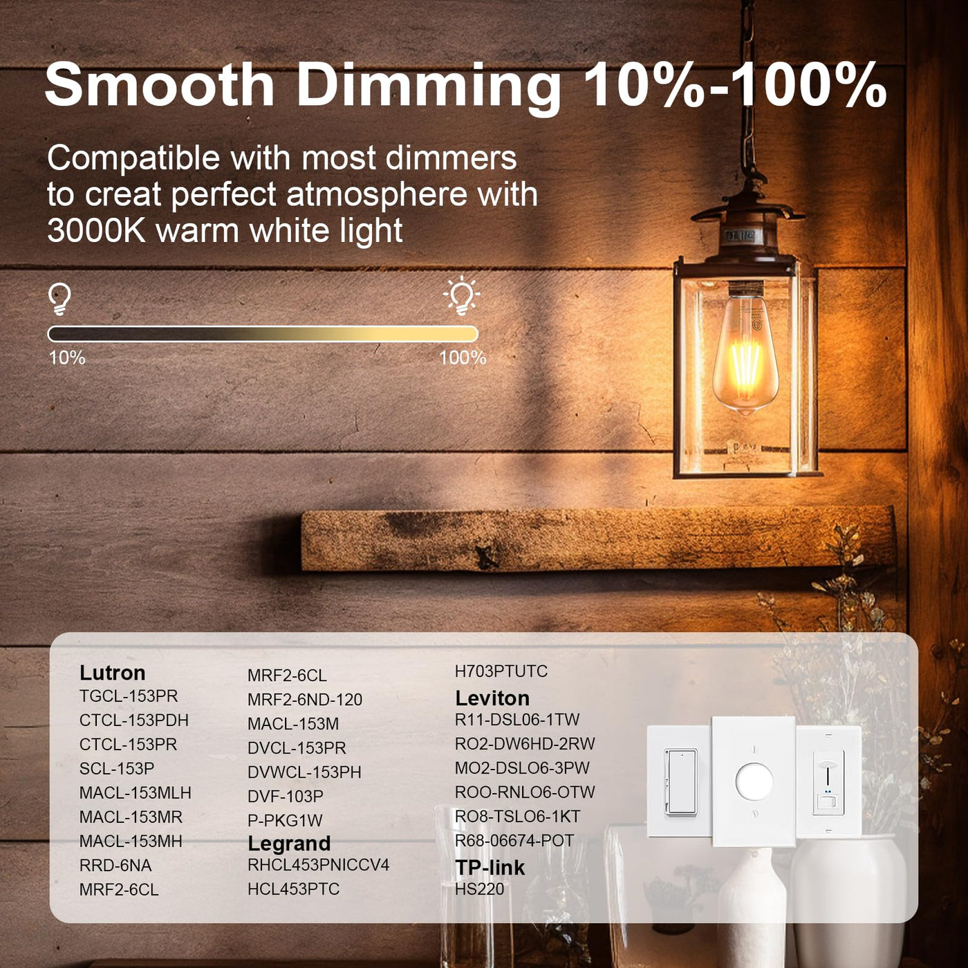 Q: Are these LED bulbs dimmable and compatible with standard dimmers?A: Yes, these ST58 LED Dimmable Edison Light Bulbs feature smooth dimming capability and are compatible with the majority of dimmers available on the market, allowing you to adjust brightness from 10% to 100%.