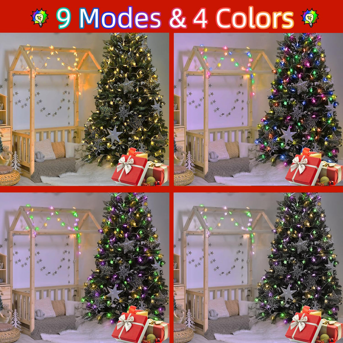 Q: How do the lighting modes work on the Star String Lights?A: These string lights offer 9 different lighting modes, including options like Steady ON, Slo-Glo, and Slow Fade. You can easily switch between these modes using a convenient button located on the plug, allowing you to customize the atmosphere for any occasion.