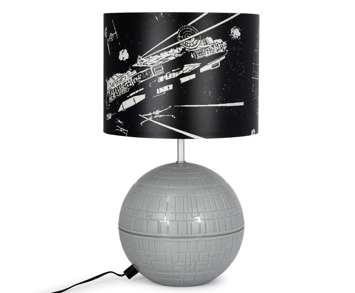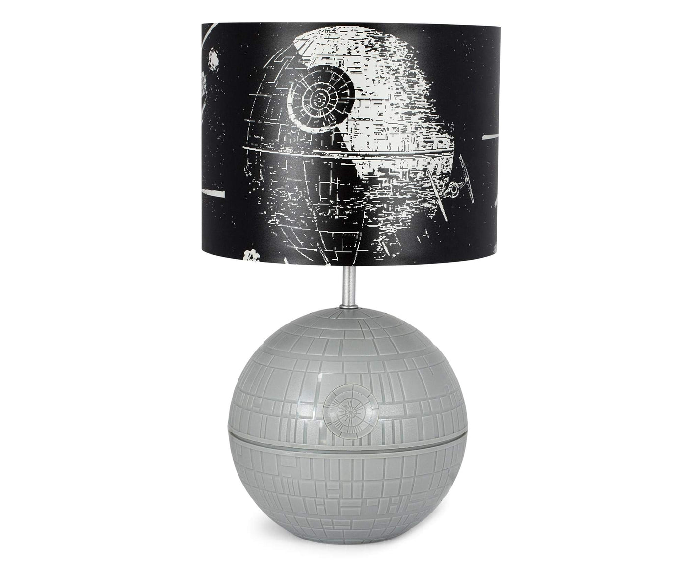 THAT'S NO MOON This Star Wars Death Star Touch Lamp is most impressive. Specially crafted with Empire-approved materials, this desk lamp features a 3D sculpted base of the iconic battle station and a black lamp shade. The printed shade features fan-favorite ships from the Star Wars galaxy, including the Death Star, TIE Fighters, X-Wings, and the Millennium Falcon. Measuring 14 inches tall and 8 inches in diameter, this collectible desk lamp is the perfect room decor accent piece for Star Wars fans of all ages. Powered by USB (cable included), this desk lamp features 3 different touch-control modes: shade only, base only, the shade and base together. Simply tap the Concave Dish Composite Beam Superlaser to make this Death Star Touch Lamp fully-operational.