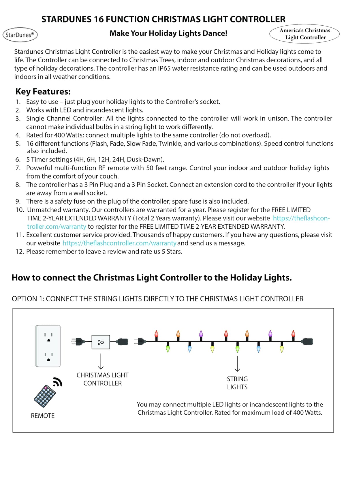 Stardunes Christmas Light Controller - 16 Dazzling Flash/Fade Functions, 5 Timer Functions, Full Function Remote