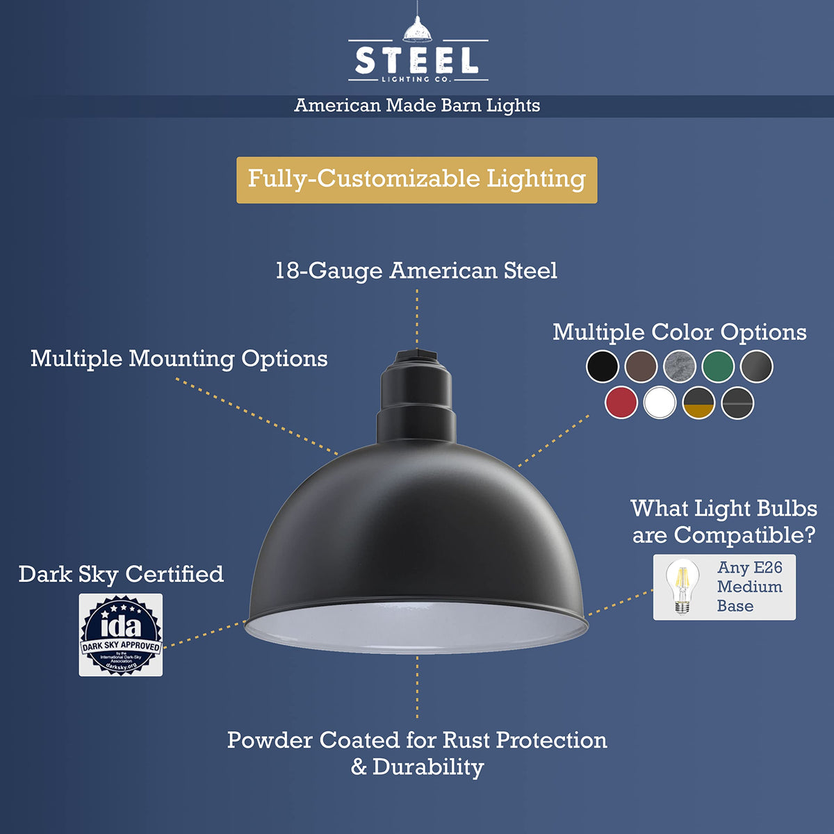 Bring your story to light with The Rose Bowl Light from Steel Lighting Co. This elegant and functional fixture is designed with a classic bowl-inspired shape, perfect for illuminating large open spaces in your home. Handcrafted in the USA from high-quality, heavy-duty, powder-coated steel, this light fixture ensures durability and long-lasting performance. With a standard 15-inch dome and a variety of mounting options, The Rose Bowl is ideal for dining rooms, barns, and any area where maximum illumination is desired.