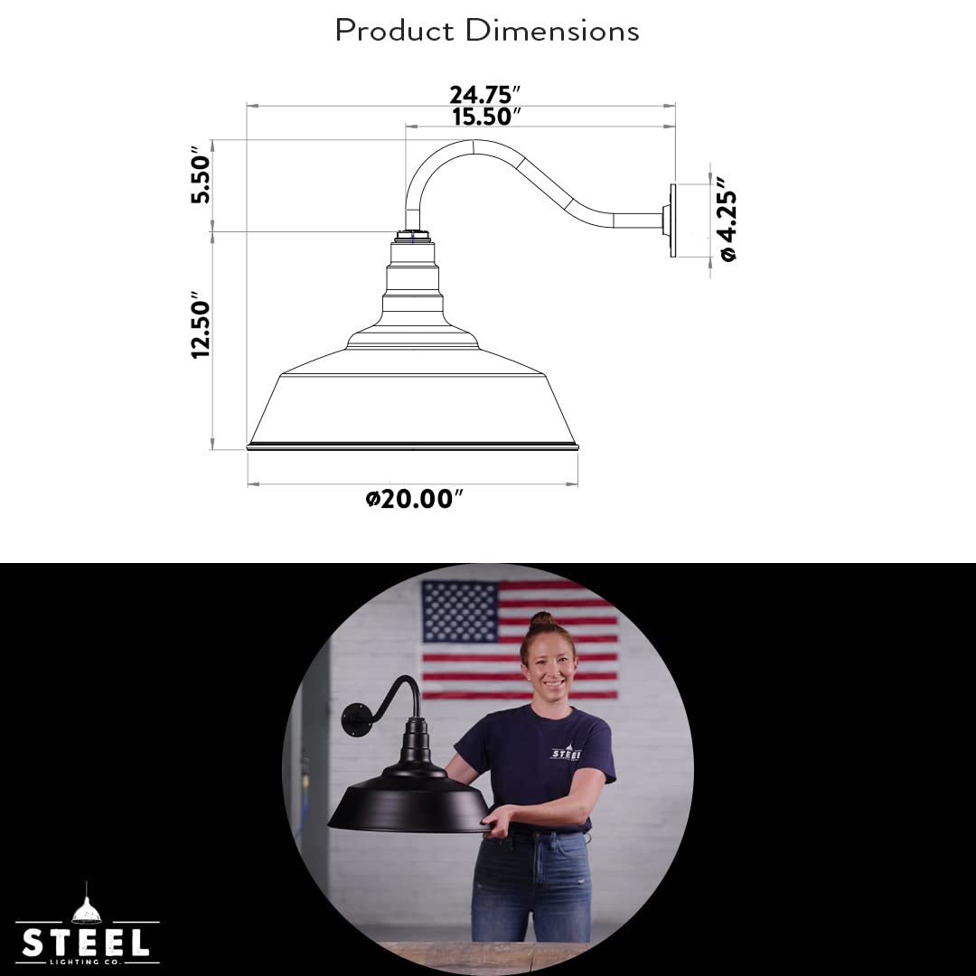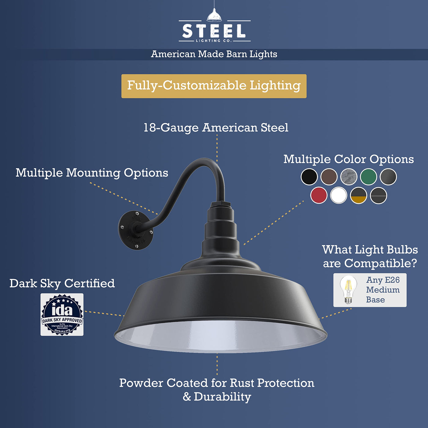 - **Customizable Lighting Style**: Personalize your barn light with a choice of colors and arm styles. Options include a 16-inch or 23-inch gooseneck, upward sloping gooseneck, or a 20-inch straight arm, making it perfect for homes, storefronts, or industrial warehouses.