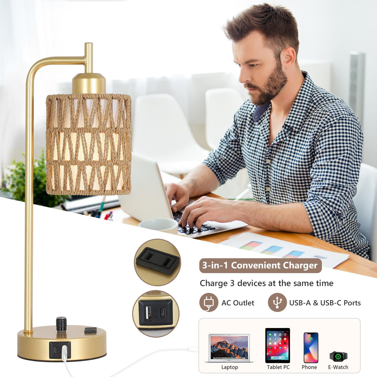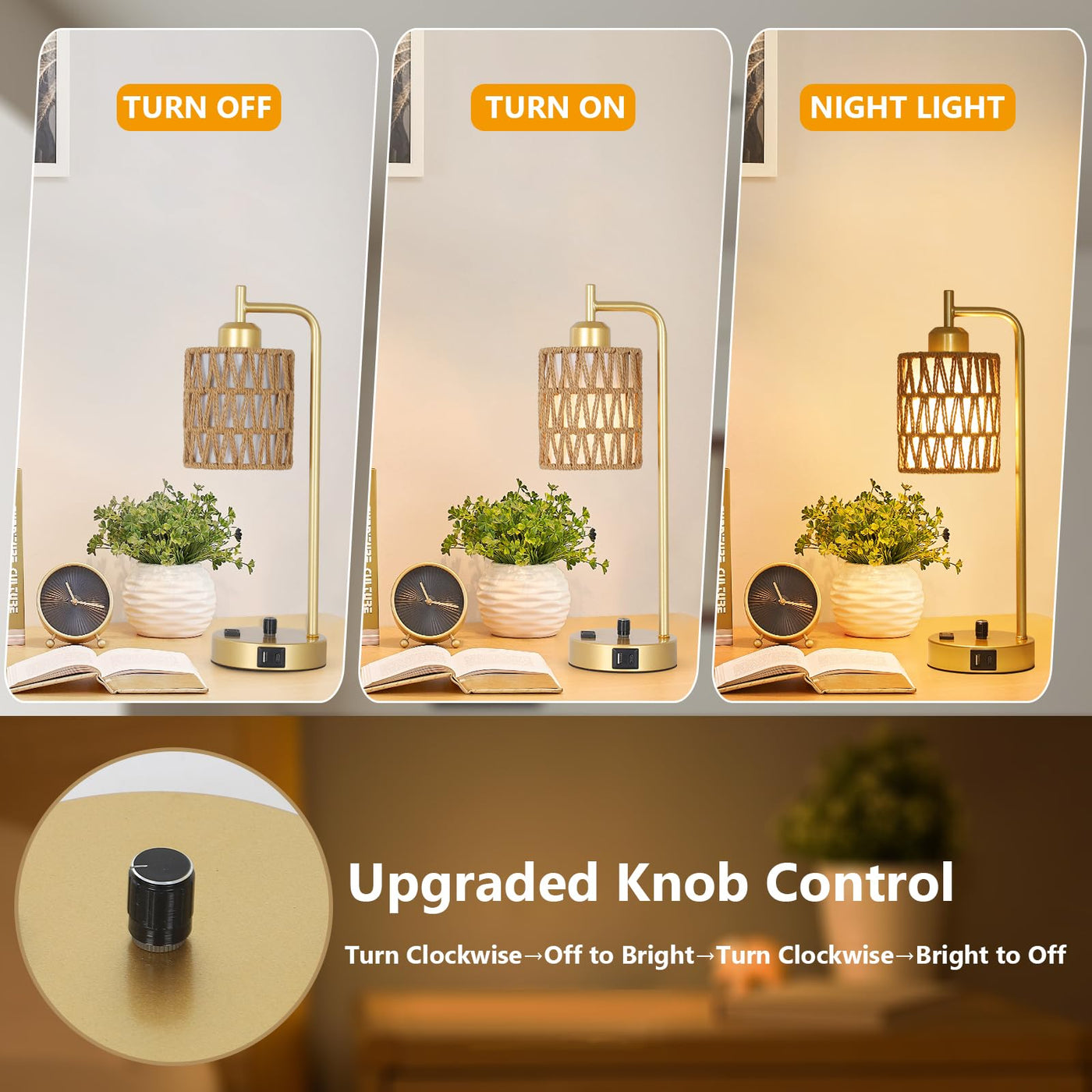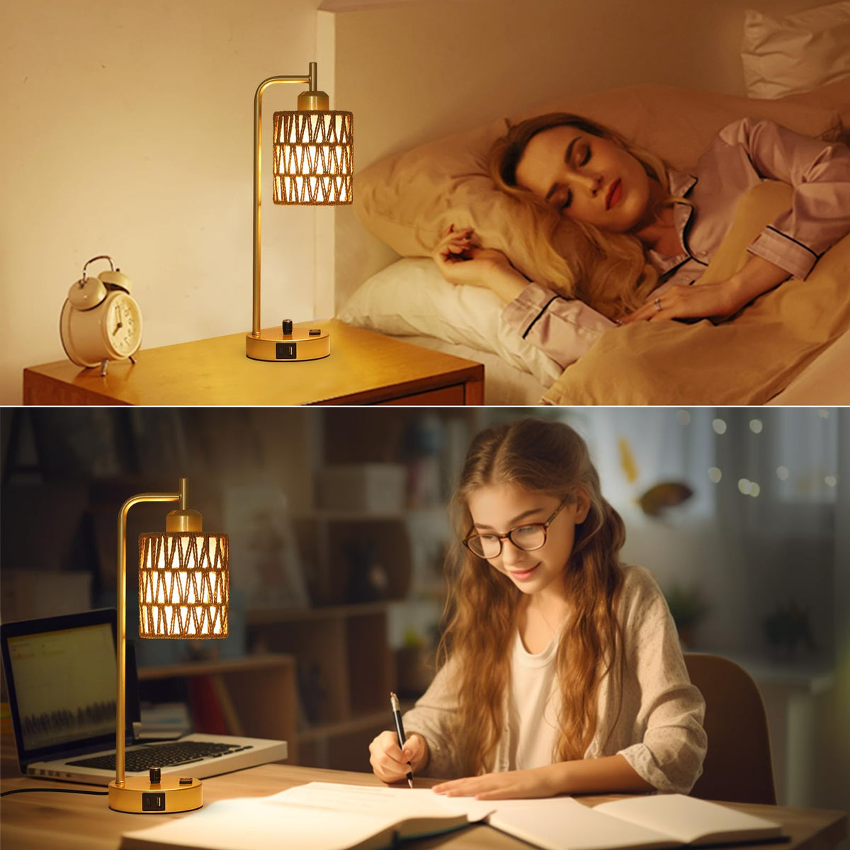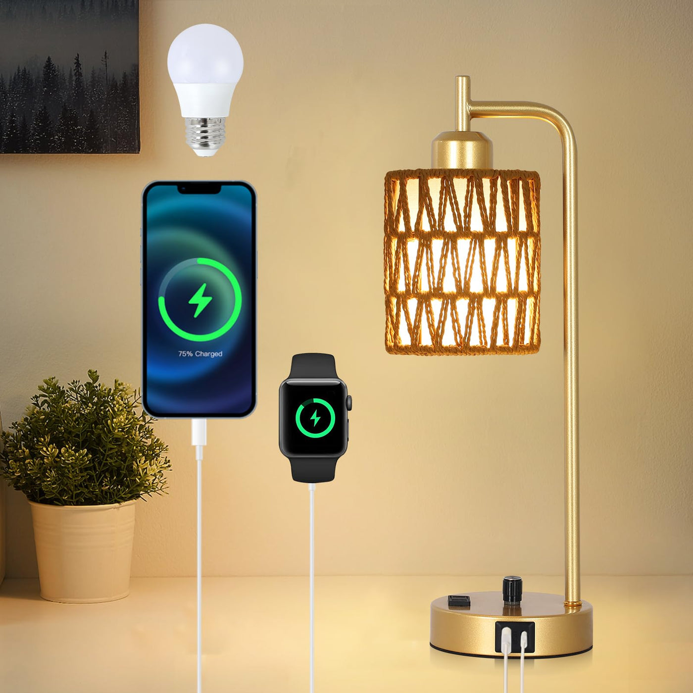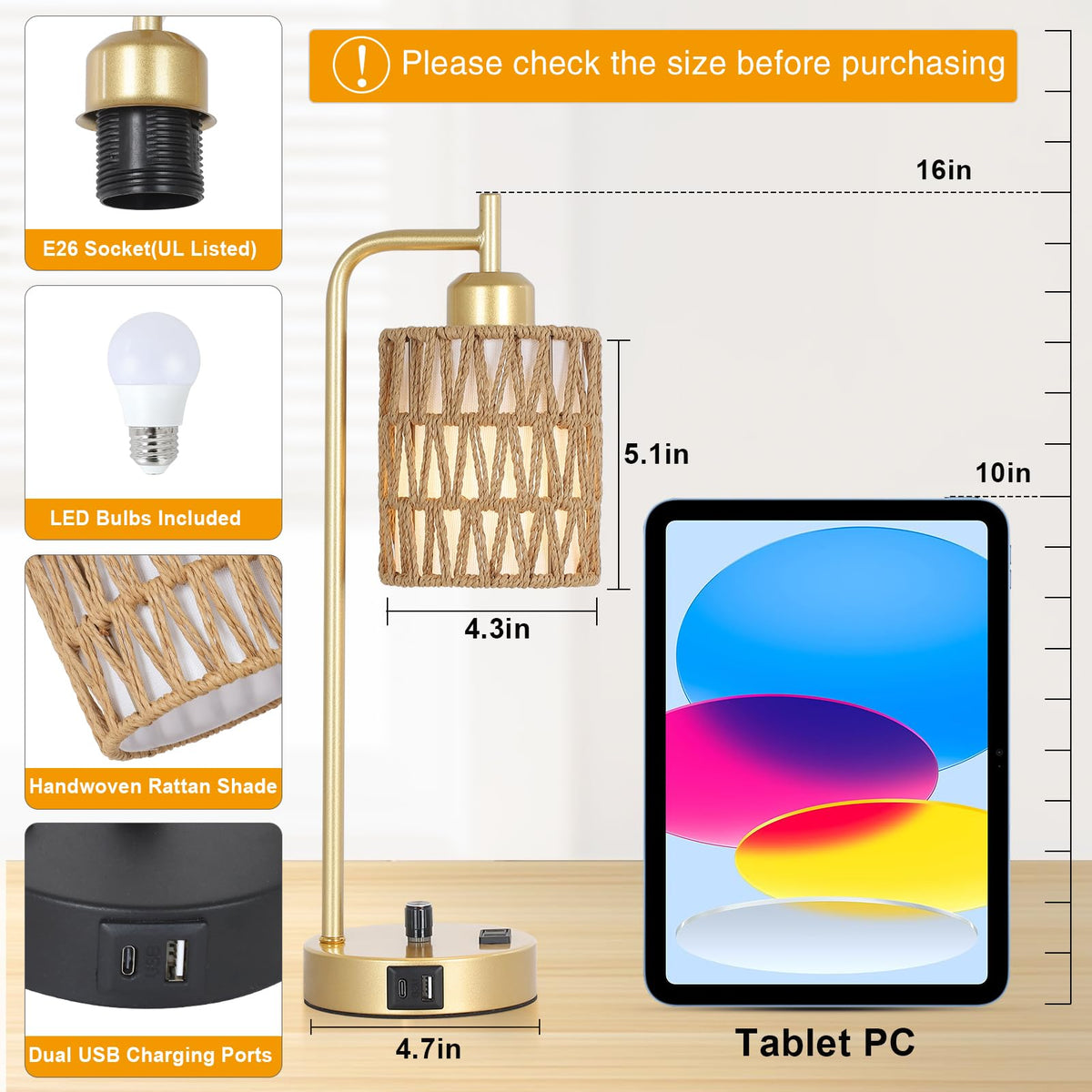 Stepeak Boho Gold Lamp For Bedroom, Small Rattan Table Lamp With Led Bulb, Nightstand Bedside Lamp With Wicker Shade, Usb Charging Ports And Outlet, Modern Side Desk Lamp For Living Room Office