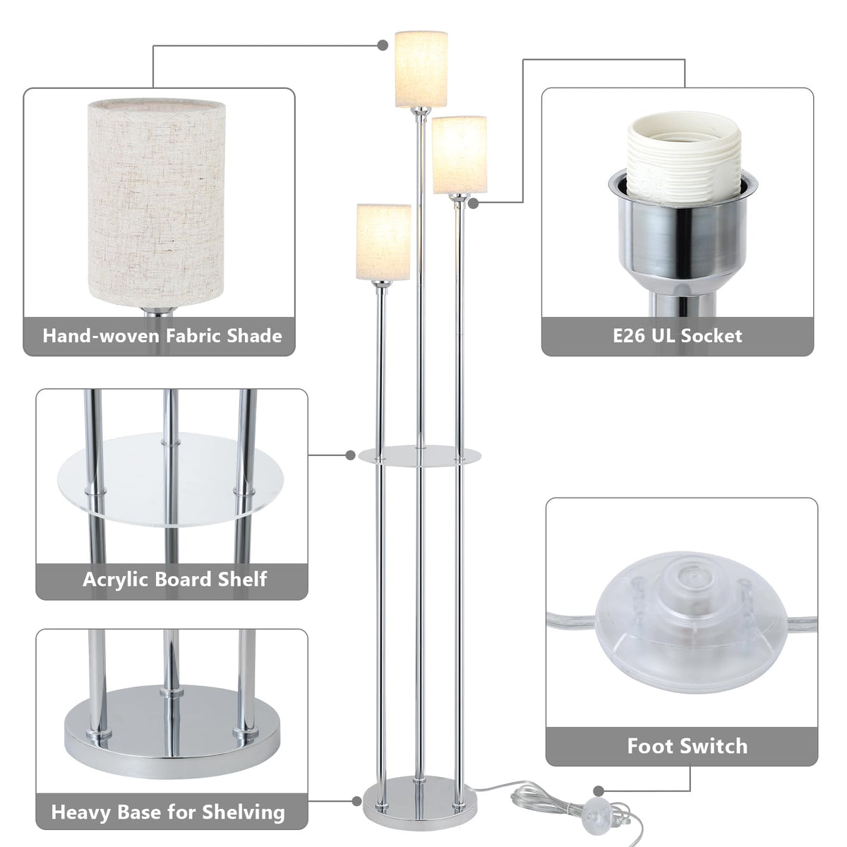 Stepeak Floor Lamps For Living Room, 3-Lights Modern Floor Lamp With Shelves, Chrome Standing Lamp With Fabric Shade And Foot Sw