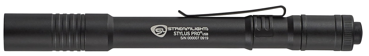 The Stylus Pro USB is a sleek compact pen sized, USB rechargeable, lithium ion battery powered flashlight designed for use in all markets. It features a tail cap switch for momentary or constant on operation, high and low modes, a pocket clip for convenience, and amazing brightness and run time for a light of its size. The aluminum housing with Type II Military Spec anodizing helps make the light extremely durable and abrasion resistant. Packaged with USB cord, removable pocket clip, and nylon holster. CASE MATERIAL: Machined aluminum alloy case. Type II MIL-Spec anodized finish. Polycarbonate lens; gasket sealed. Length: 5.95 in. (151 mm) Body Diameter: 0.63 in. (16 mm). WEIGHT: 1.8 oz (51.0 grams) with battery. LED technology, impervious to shock with a 30,000 hour lifetime. LIGHT OUTPUT: High - 2950 candela peak beam intensity, 109 meter beam distance and 350 lumens measured system output. Low - 840 candela peak beam intensity, 58 meter beam distance and 90 lumens measured systemoutput. Push button tail switch – momentary or constant on operation. High - 1.5 hours of run time. Low - 3.5 hours of run time. Streamlight Lithium Ion cell pack with on board safety circuit. Rechargeable up to 300 times. Fully recharges battery in 2.5 hours and charges battery in product. Charge indication LED: Red – Charging; Green – Charged. IPX4 rated for water resistant operation. All openings o-ring sealed. 1 Meter impact resistance tested. Micro USB charge port under water resistant sliding cover. Rechargeable using supplied USB cord.