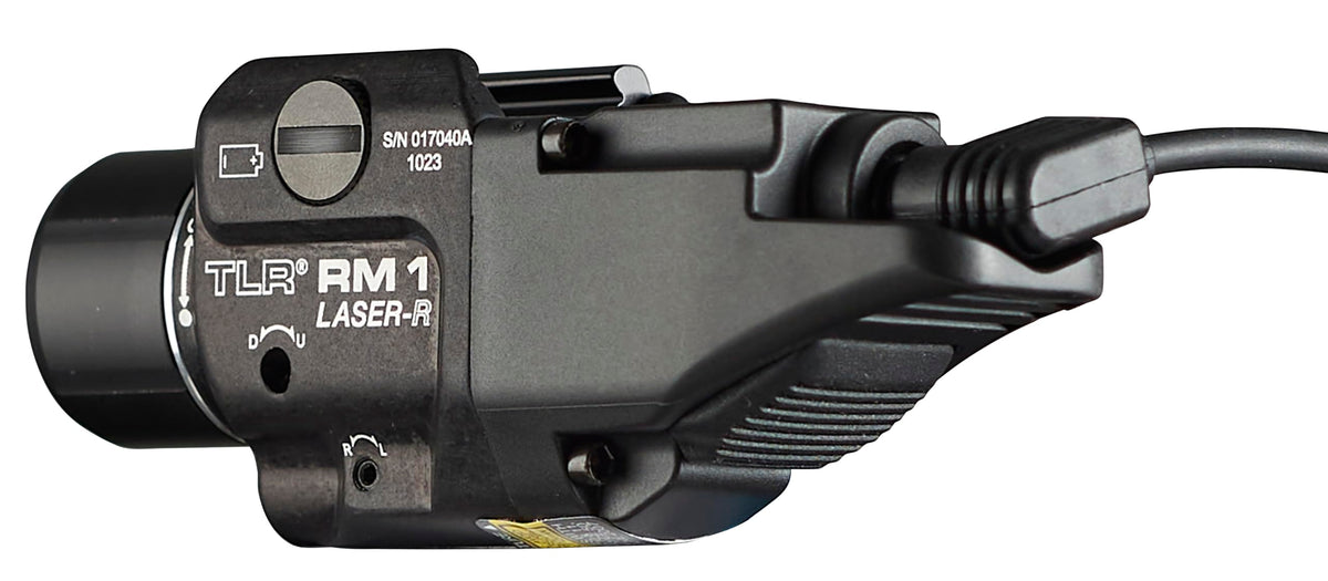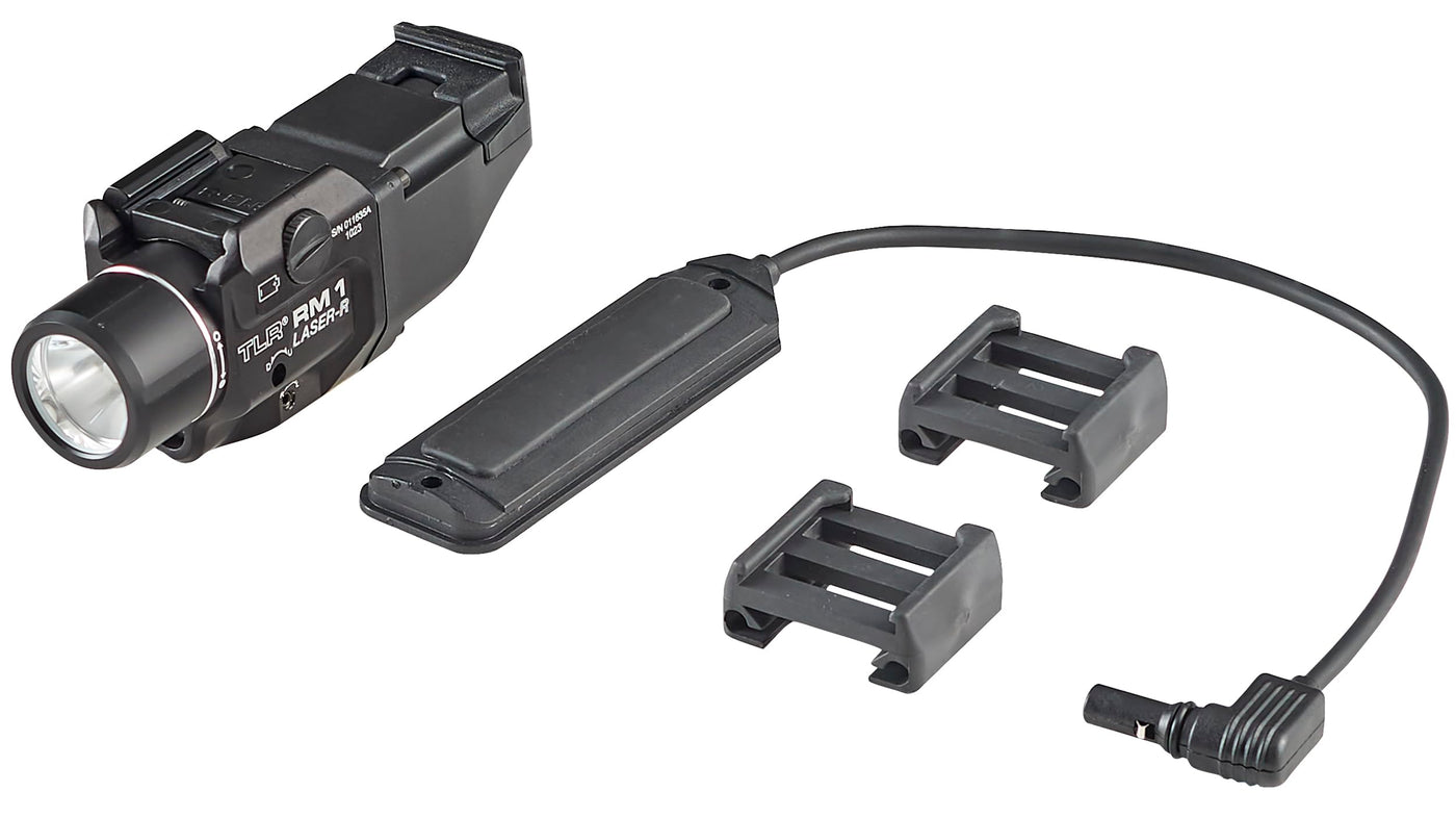 The Streamlight 69445 TLR RM 1 Laser with remote pressure switch is a tactical flashlight for professionals who require reliable, high-performance illumination. Providing an impressive 500 lumens of bright white light and 11,000 candelas with a beam reach of 210 meters. Featuring an HPL face cap for a longer reach and a tighter beam. Its designed to produce more candela while maintaining lumen output. Independently operating push-button and remote pressure switches provide the security of knowing youll always have light. The TLR RM 1 has a mode selector toggle switch for adjustable light modes that feature, light only, laser only, light and laser combo plus strobe. The TLR RM 1 has a fully integrated class 3R red aiming laser with an output of