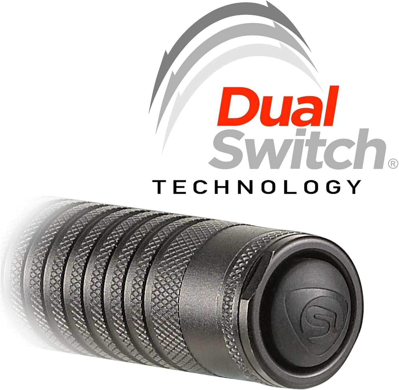 You Asked, we listened! our dual switch technology is now available in the strion DS hpl - which produces a wide beam pattern with brighter peripheral illumination and superior down-range performance. Strobe for disorienting or signaling: runs 2.5 hours. Deep-dish parabolic reflector provides a long-range targeting beam with optimum peripheral illumination. C4 LED technology for extreme brightness. Lithium Ion battery is rechargeable up to 1,000 times; fully recharges in 3 hours. Clamp style charger holder with digital control circuit that prevents over-charge; LED indicates charge status. Piggyback charger doubles your run time by charging a spare battery (sold separately) so you can keep on working; reduces down time. IPX4 water-resistant; 2M impact resistance tested. 6000 Series anodized machined aircraft aluminum; unbreakable polycarbonate lens with scratch-resistant coating. 7.56-Inch (19.20 cm); 6.9-Ounce (196 grams). serialized for positive identification.