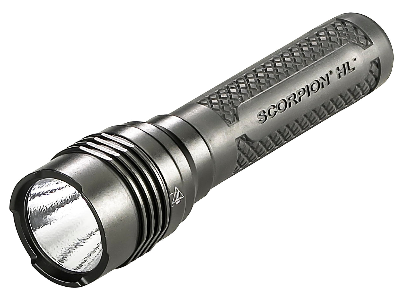 Replicates the size, shape and feel that you love so much about the Scorpion series, but with new technology and a 600-lumen output. It also features TEN-TAP Programming that gives users the choice of three operating modes. The combination of small size and output from the LED result in one of the brightest personal carry lights for its size. Rubber armor grip sleeve provides a sure grip. The barrel and head are crafted from 6000 series machined aircraft aluminum and the head has an anodized finish. The glass lens is O-ring sealed. The light source features LED technology, impervious to shock with a 50,000-hour lifetime. The Scorpion HLs multi-function, push-button tactical tail switch allows for one handed operation of momentary, variable intensity or strobe mode. This TEN-TAP programmable switch allows user selection of one of three different programs: high/strobe/low (factory default), high only, or low/high. Electronic power regulation provides maximum light output throughout battery life. Built for durability, the Scorpion HL features an IPX7 rated design, waterproof to 1-meter for 30-minutes, and is 1-meter impact resistance tested. Powered by 2 3-volt CR123A lithium batteries with a shelf life of 10-years. Includes anti-roll face cap and batteries. Serialized for positive identification. Dimensions: 5.46-inches long, 0.96-inch barrel diameter, 1.375-inch head diameter, and 1.45-inch tri-lobe diameter. Weighs 4.8-ounces with batteries.