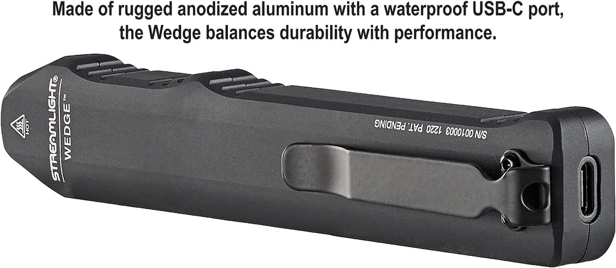 Q: What materials is the Streamlight Wedge flashlight made from?A: The Streamlight Wedge flashlight is constructed from rugged anodized aluminum, providing both durability and a lightweight design, ideal for everyday carry.