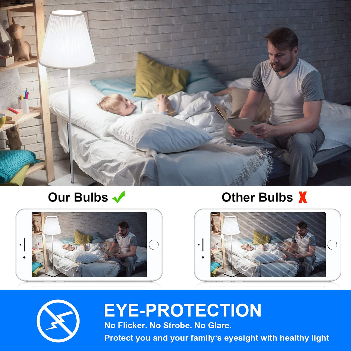 ???60W Equivalent Eye-Caring Light?With a powerful output of 800 lumens, these dimmable LED bulbs efficiently replace traditional 60W incandescent bulbs while consuming only 7 watts, resulting in up to 90% energy savings. Enjoy stable, flicker-free illumination that protects your eyes from harsh glare.