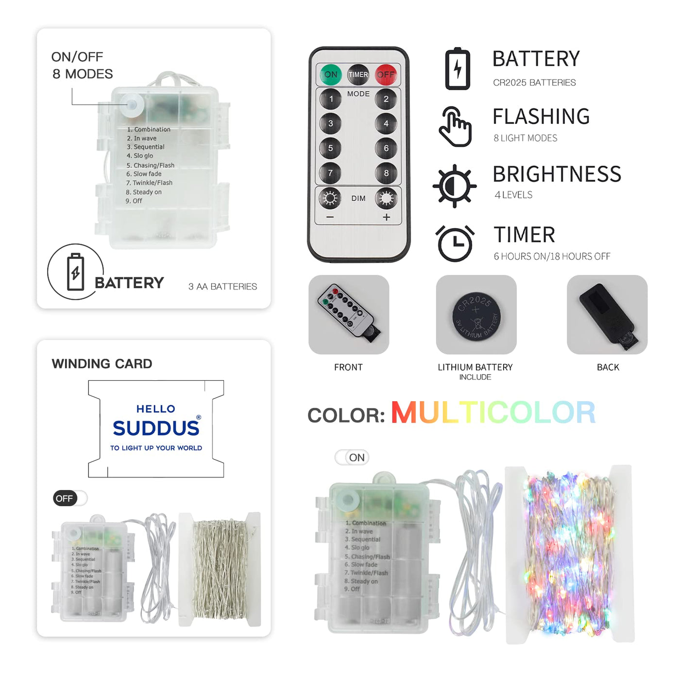 SUDDUS 33ft 100 LED Outdoor String Lights, Multi Color Fairy Lights Battery Operated with Remote, Led Twinkle Lights for Bedroom, Backyard, Wedding, Tree, Mason Jar, Wall, Centerpiece, Christmas