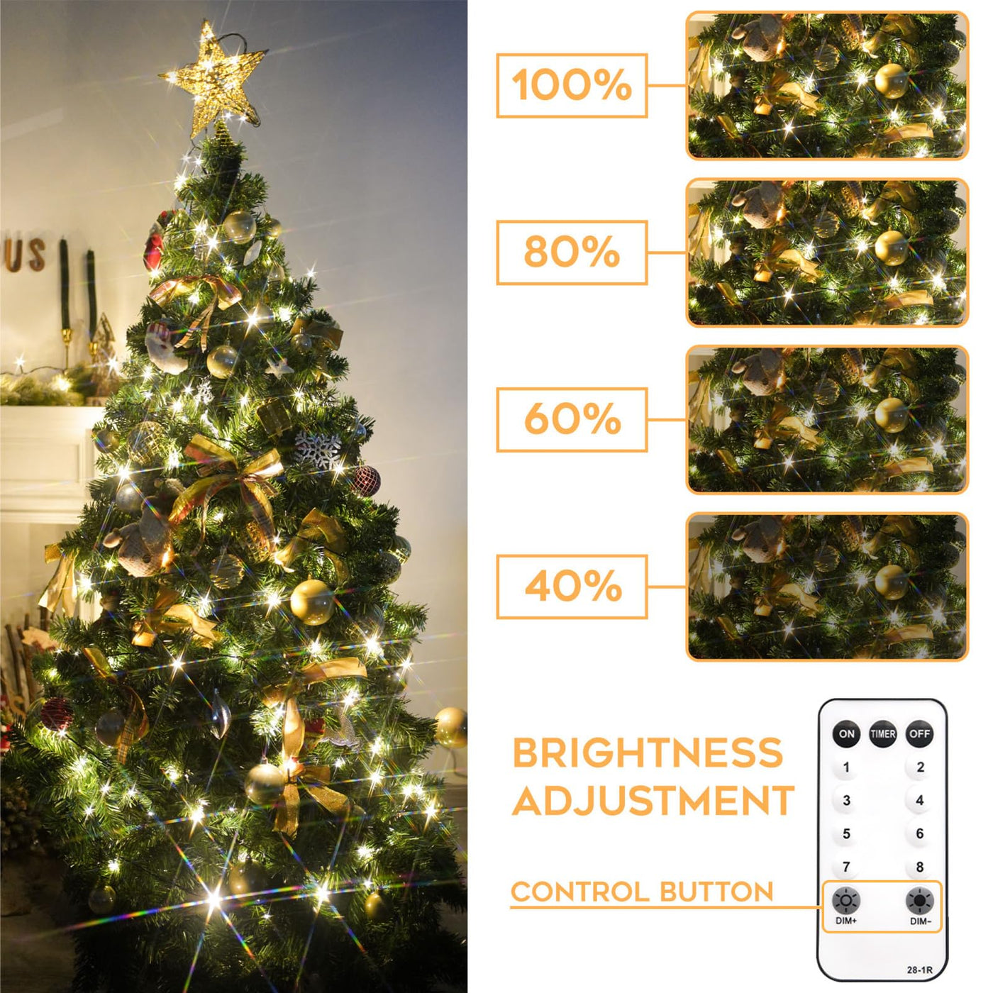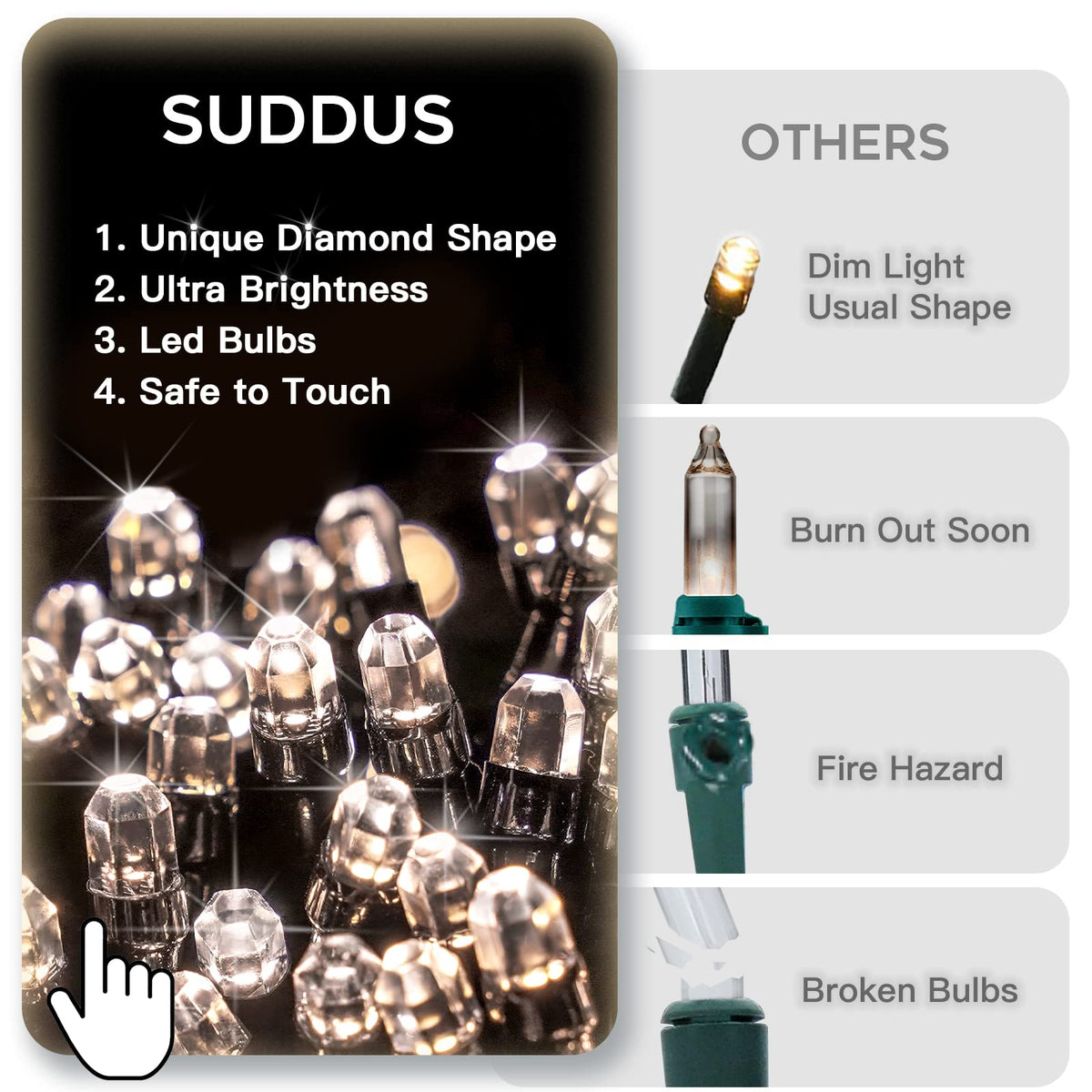 [Diamond Shape/ High Brightness] SUDDUS upgraded warm white 200led Christmas lights are diamond shape with precision cutting technology. With the light refraction, the brightness of diamond shape the light is far superior to other lights. It will certainly make your Christmas tree the shiniest one. [8 Modes/ Timer] SUDDUS diamond shape xmas lights have 8 light modes: steady on and 7 flashing modes including combination, in waves, sequential, slo-glo, chasing/ flash, slow fade, twinkle/ flash. The timer will keep the Christmas light turned on for 6 hours, with a 18-hour off every 24 hours. You can press the timer button twice or turn off the Christmas string lights to cancel the timer function. [Remote Control/ Memory Function] It’s much convenient to switch the mode, adjust brightness and set timer with remote. The remote control range of the diamond shape lights is 110ft/ 33.6m. The built-in memory chip saves your last mode and brightness setting, no need to reset again. [Waterproof/ Safety] Christmas tree lights and connectors are IP44 waterproof. They can work normally against splashing water from any angle. LED Christmas lights are 29V low voltage. UL certified plug ensure the safety. So it’s safe to touch. [Widely Use] The dark wire are invisible in Christmas trees and grass. Perfect for indoor and outdoor decorations, like Christmas trees, fireplace, wedding, door frame, patio, balcony, garden, etc. It helps you to create a joyful and merry ambiance at Christmas. [Satisfaction Guarantee] All of our Christmas lights come with 30-day free exchange service and 12-month warranty. And we will be 24/7 online. If you have any questions about this product, please feel free to contact our customer service, we will solve problems for you.
