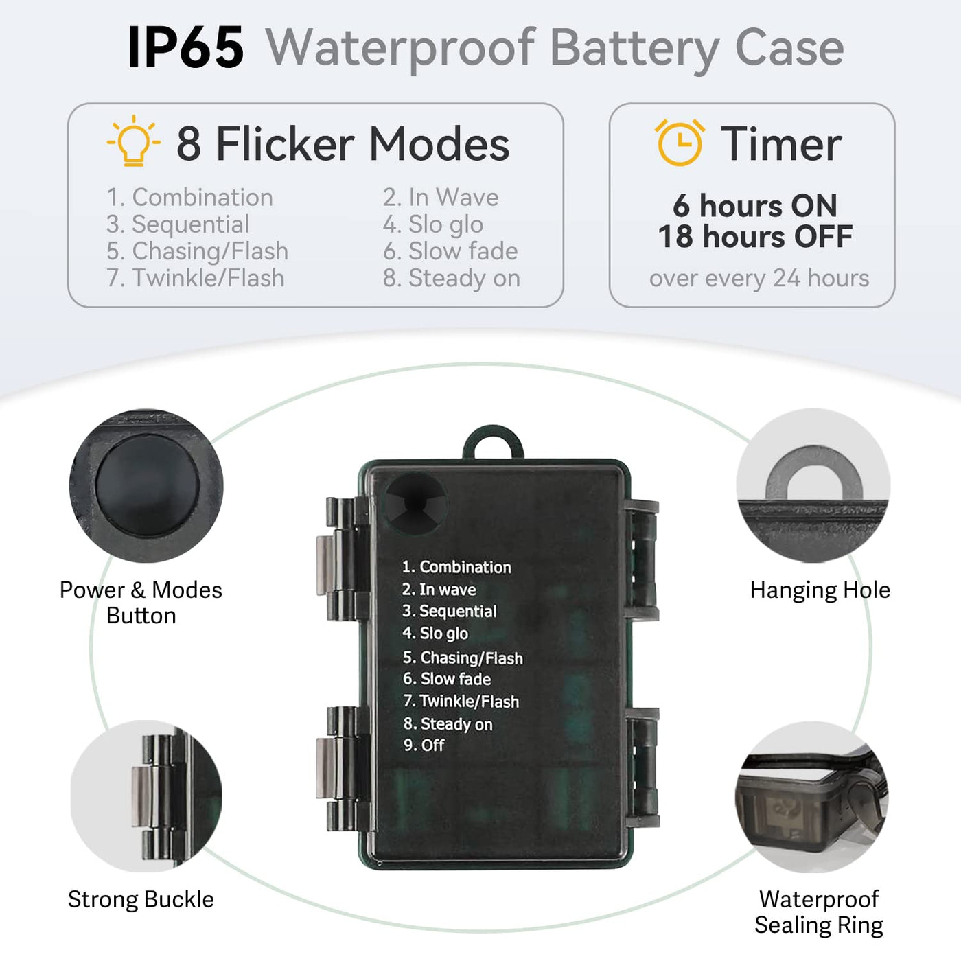 Q: What are the different lighting modes available for these string lights?A: The Sukesou string lights offer 8 different lighting modes, including Combination, In Waves, Sequential, Slo-Glo, Chasing/Flash, Slow Fade, Twinkle/Flash, and Steady on, perfect for various occasions.