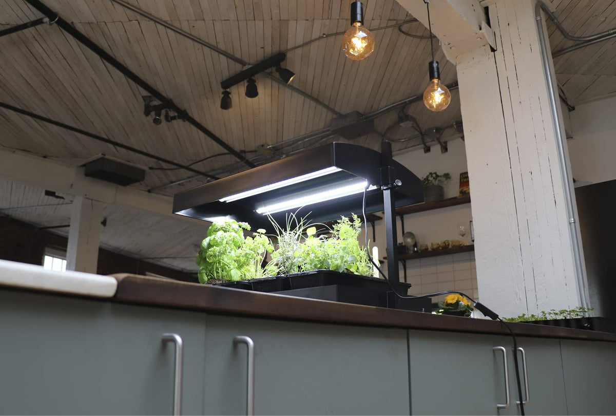 The SunBlaster Growlight Garden Kit comes to you as a complete, ready-to-grow indoor hydroponics garden. Just assemble and add your favorite soil or potting mix, seeds (or seedling plants), water, and you will be growing in no time. It's just that easy! Highly efficient SunBlaster 18 Watt full spectrum 6400k LED grow light strips replicate Mother Nature for safe rapid indoor plant growth. The heavy-duty base provides a reservoir for watering and feeding, as well as catching overflow, while an absorbent WICKING MAT draws water up and into the bottoms of the seed trays; by capillary action to auto-water your garden for up to 7-14 days, depending on plant and climate conditions. The unique reusable seedling tray design allows air circulation between the wicking mat and the tray bottom, providing proper air flow to keep roots healthy and happy. As your plants grow, so can the easily adjustable canopy, up to 18“, accommodating most common herbs, salad greens, vegetables, micro greens and flowers with ease. With a 16 x 24” footprint, it will fit nicely in your apartment, kitchen, office, mobile home, etc and helps encourage a healthier lifestyle with homegrown greens in your life within arms reach.