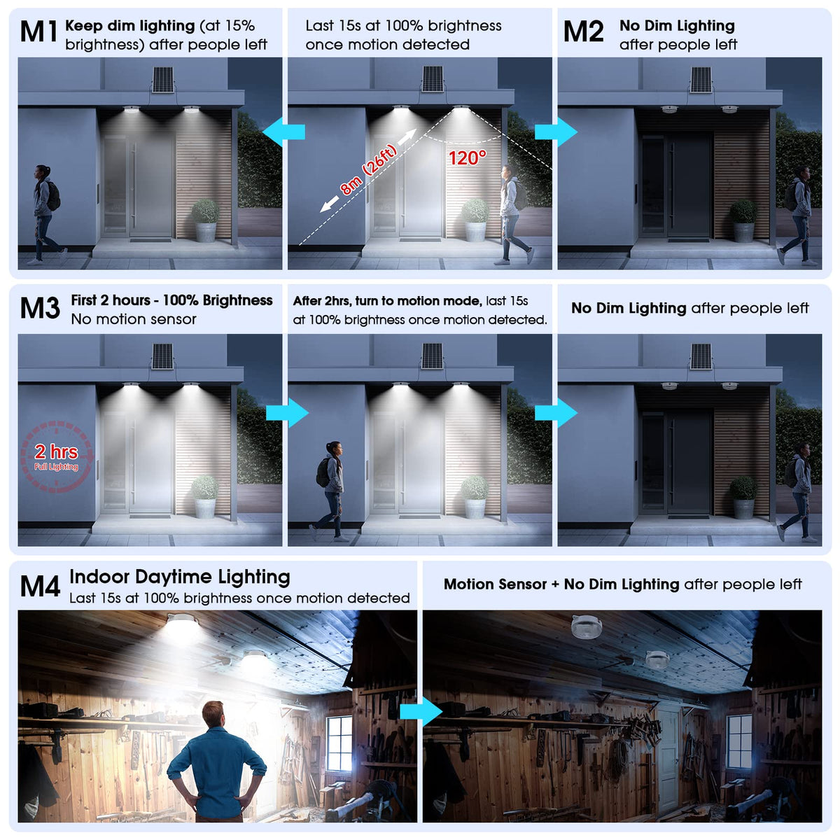 Q: What are the different lighting modes available with the SunBonar Solar Ceiling Light?A: The SunBonar Solar Ceiling Light features 5 distinct modes: 1) Dim-to-Bright with Motion at night, 2) OFF-to-Bright with Motion at night, 3) 2 hours of lighting followed by OFF-to-Bright with Motion at night, 4) OFF-to-Bright with Motion during daytime, and 5) AUTO mode from Dusk to Dawn without using the Motion Sensor.