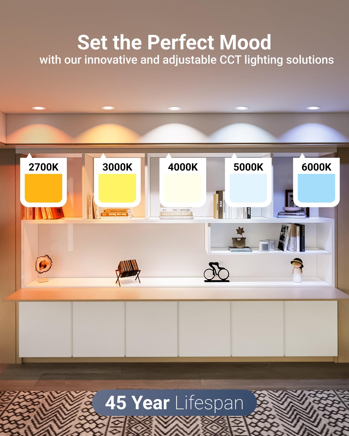 Q: What are the adjustable color temperatures for the Sunco 4 Inch LED Recessed Ceiling Lights?A: The Sunco 4 Inch LED Recessed Ceiling Lights offer adjustable color temperatures of 2700K, 3000K, 4000K, 5000K, and 6000K, allowing you to customize the lighting to fit your mood or decor.