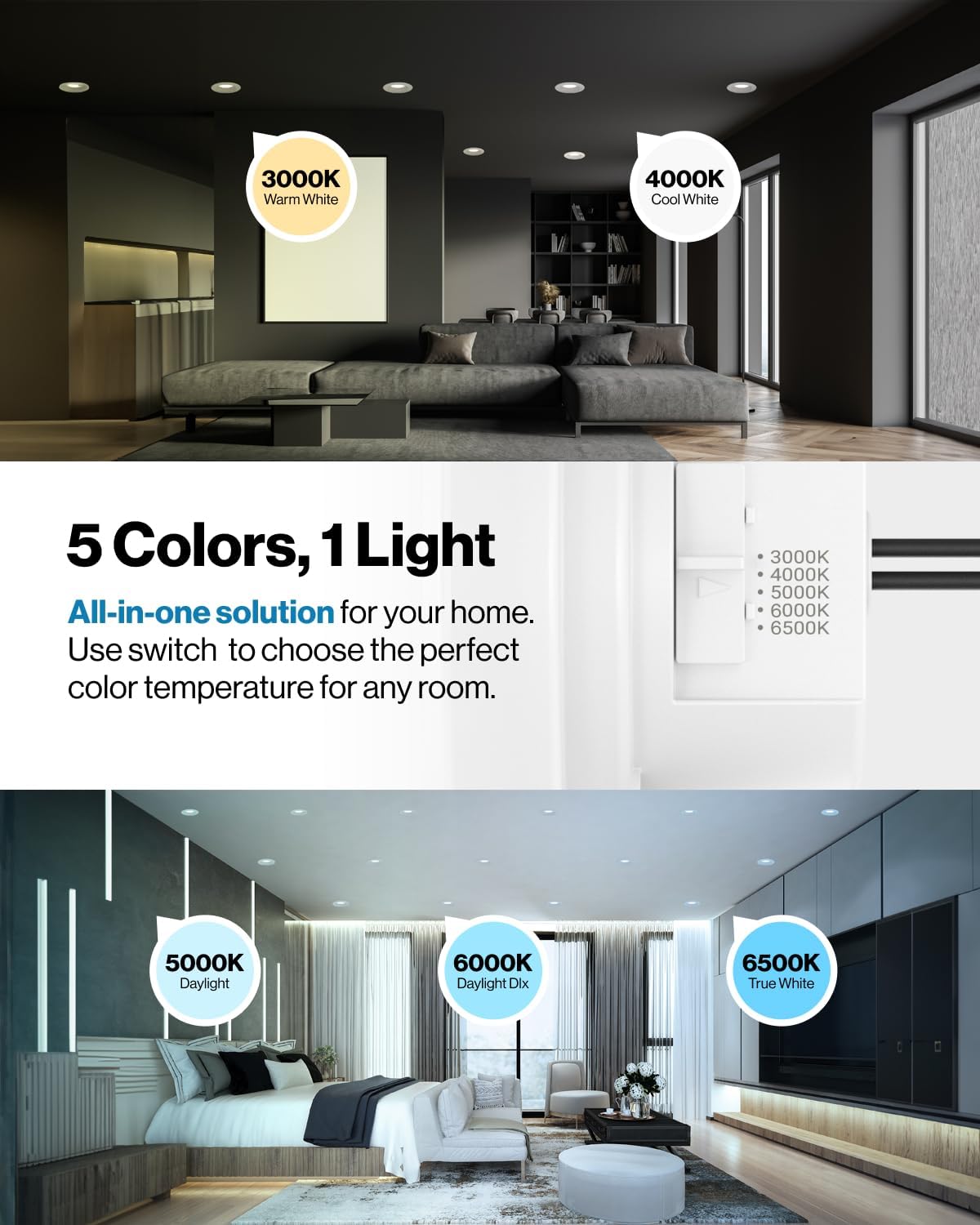 Q: What color temperatures can I choose for the Sunco 4 Inch Recessed LED lights?A: The Sunco 4 Inch Recessed LED lights feature a selectable color temperature (CCT) switch that allows you to choose from five options: 3000K, 4000K, 5000K, 6000K, and 6500K. This versatility ensures you can set the perfect ambiance for any room.