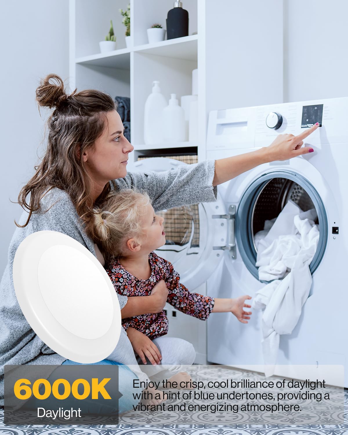 Q: What color temperature do these LED lights emit?A: The Sunco LED Disk Lights emit a bright 6000K Daylight Deluxe color temperature, which is ideal for creating a vibrant and energizing environment. This color temperature is perfect for workspaces or areas where you need clear visibility.