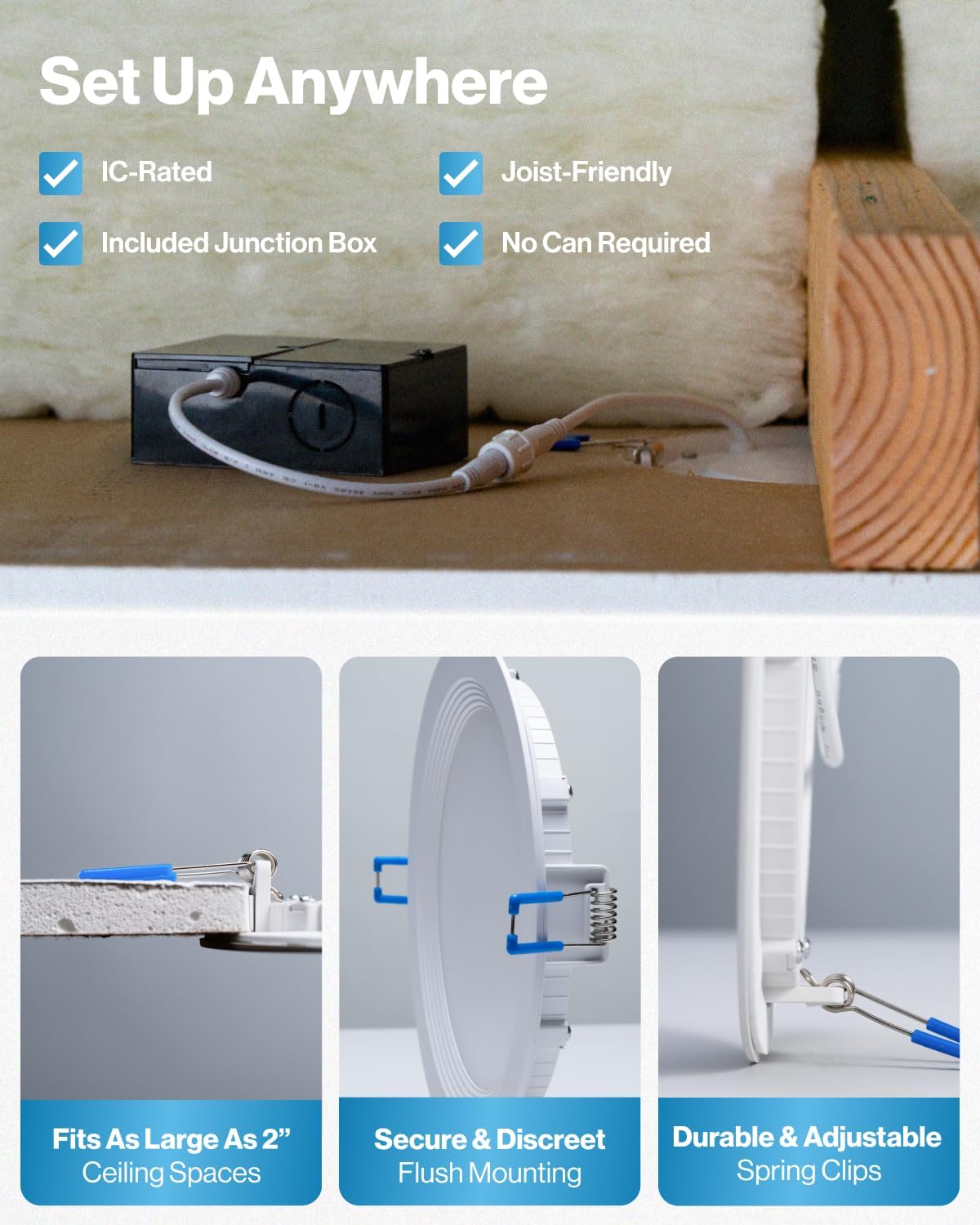 Q: What size junction box is required for installation?A: These canless wafer-thin lights come with a junction box included, so you don't need to purchase an additional one. They are designed for easy installation in ceilings with minimal space.