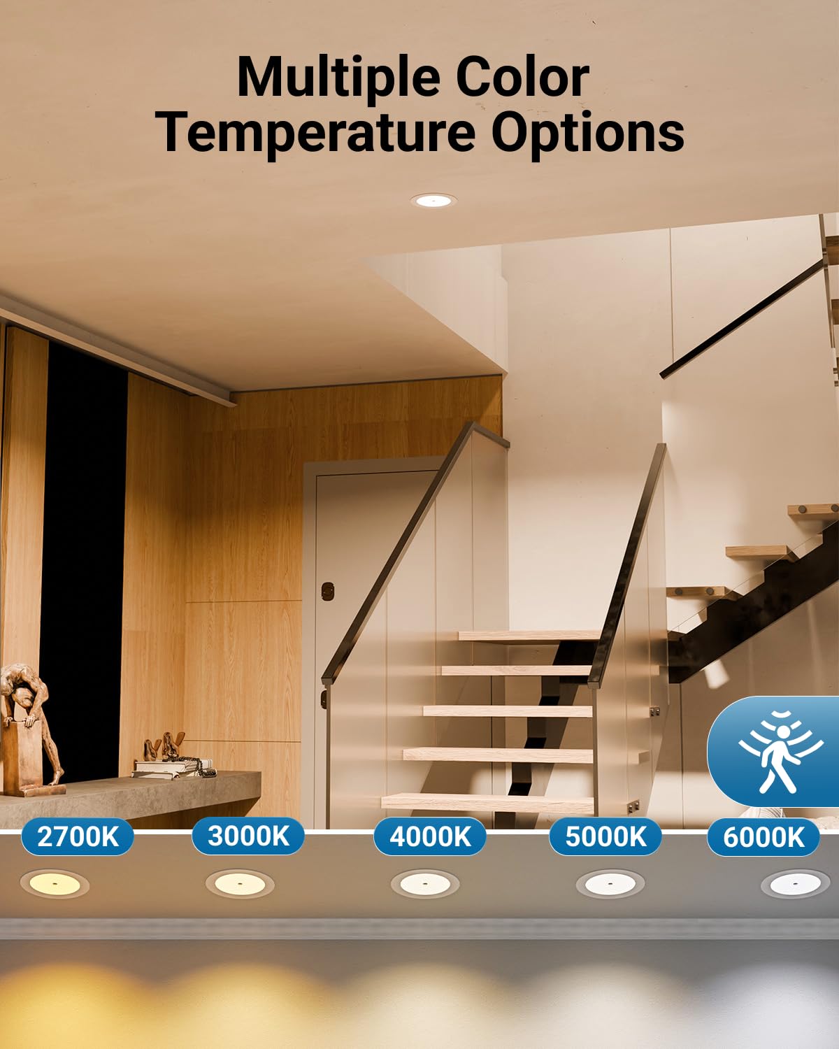 Q: Can I adjust the color temperature of the Sunco Motion Sensor Recessed Light?A: Yes, the Sunco Motion Sensor Recessed Light features selectable color temperature options, allowing you to choose from five different settings: two thousand seven hundred Kelvin, three thousand Kelvin, four thousand Kelvin, five thousand Kelvin, and six thousand Kelvin.