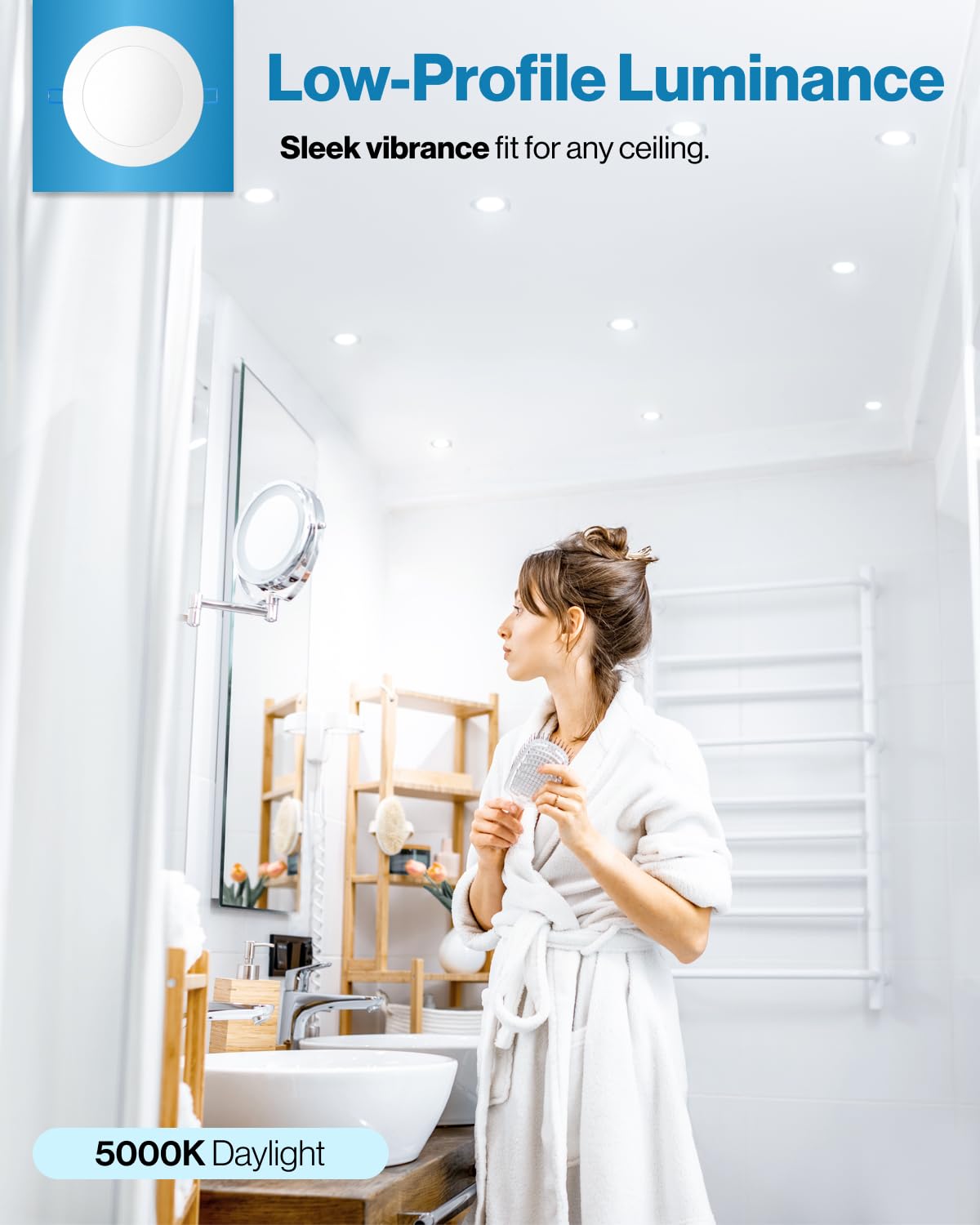 Q: What is the brightness of the Sunco 6 Inch Ultra Thin LED Recessed Ceiling Lights?A: The Sunco 6 Inch Ultra Thin LED Recessed Ceiling Lights provide a bright output equivalent to a 14W power consumption, delivering a daylight color temperature of 5000K for optimal illumination.