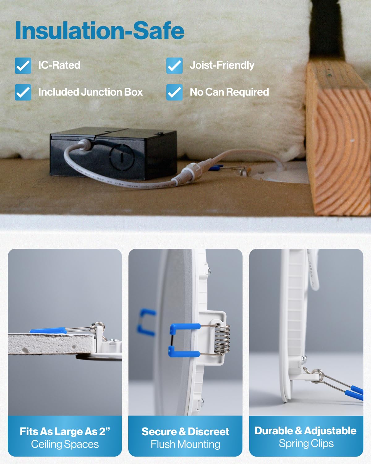 Q: Is the Sunco recessed light safe for use with insulation?A: Yes, these lights are IC rated, which means they are thermally protected and safe for direct contact with ceiling insulation, preventing overheating or ignition.