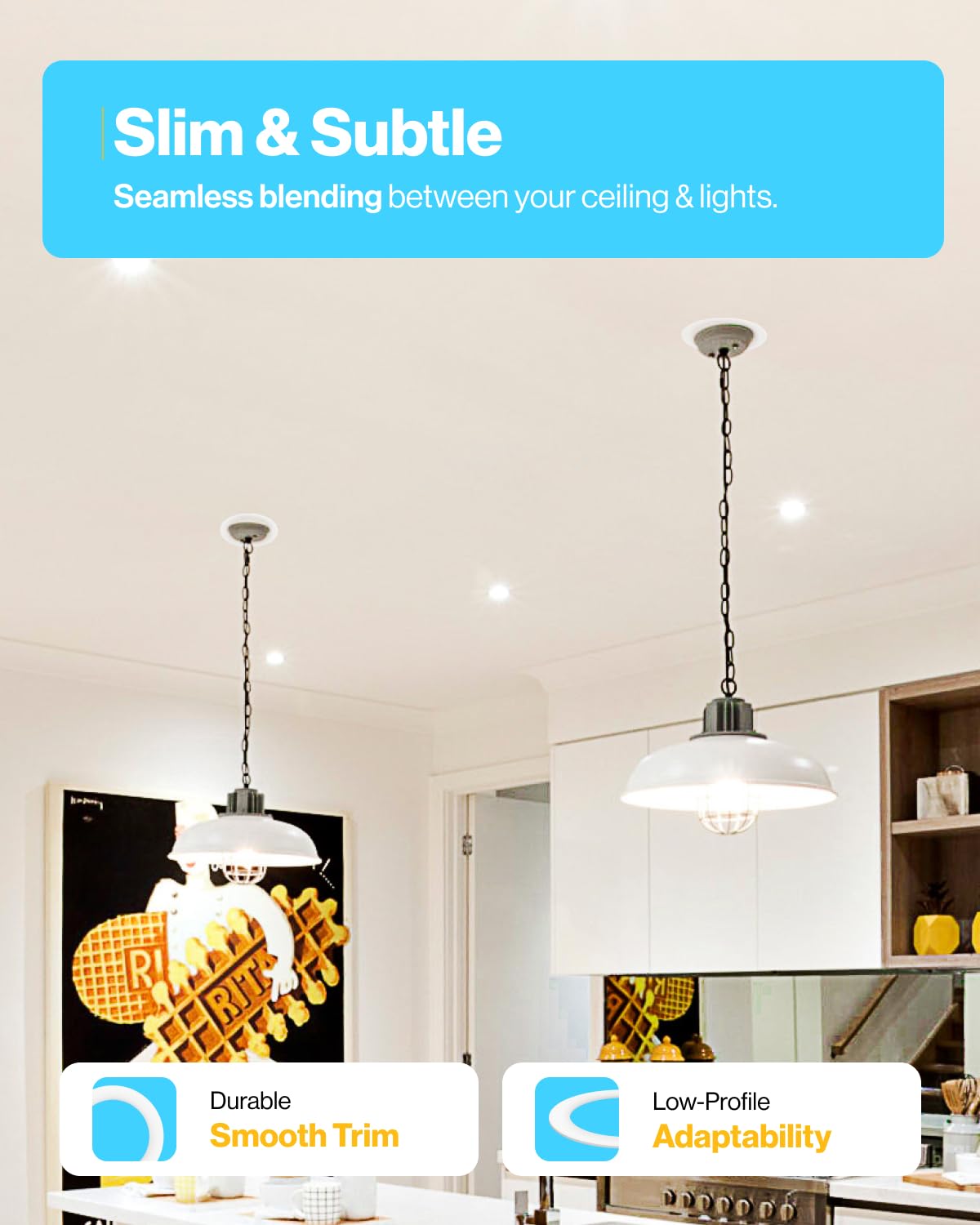 Q: How do I install the Goof Rings?A: Installing the Goof Rings is simple and requires no tools. The trim overlay sits flush against the ceiling and easily slips onto the back of your recessed light, fitting between the light's trim and the ceiling drywall to cover any gaps.
