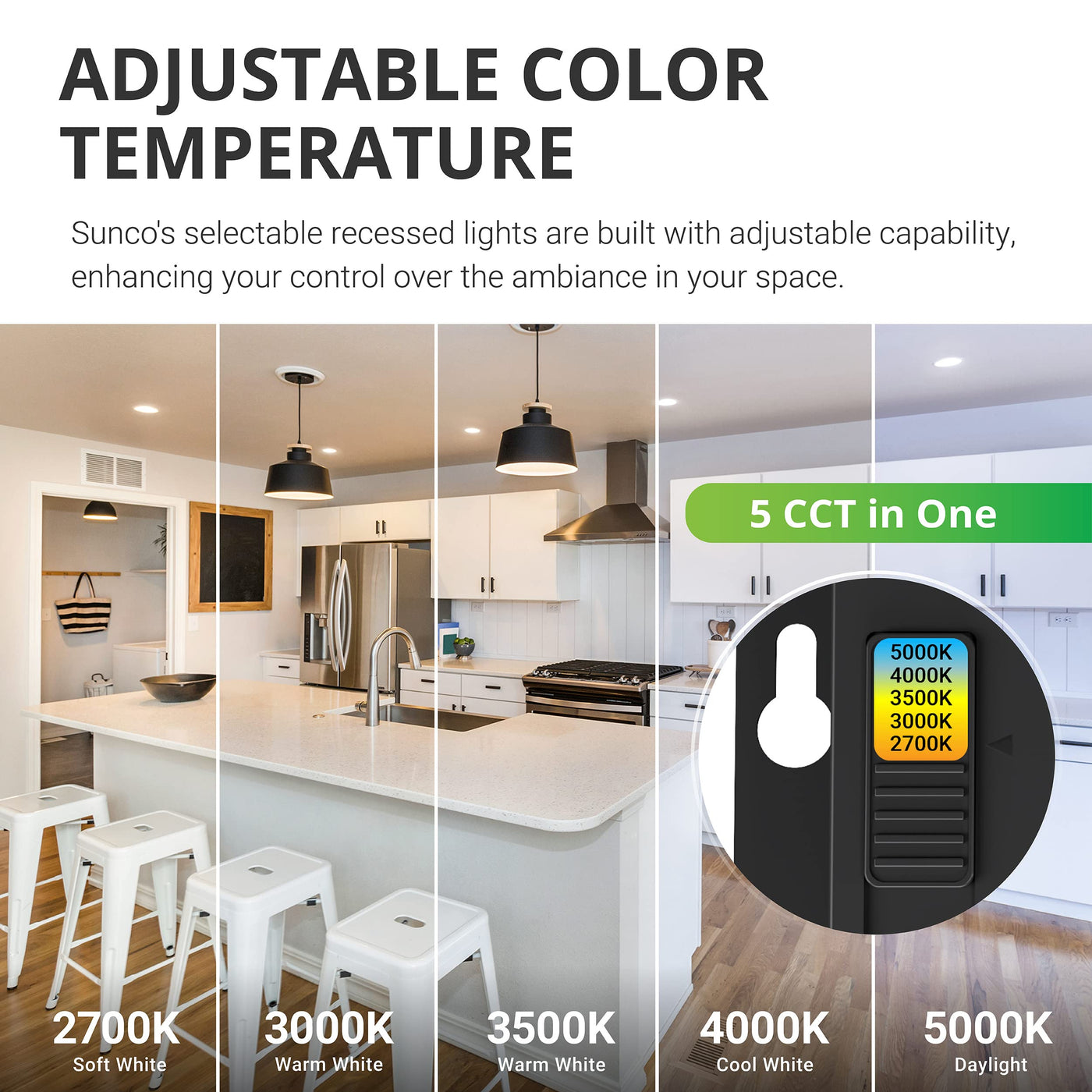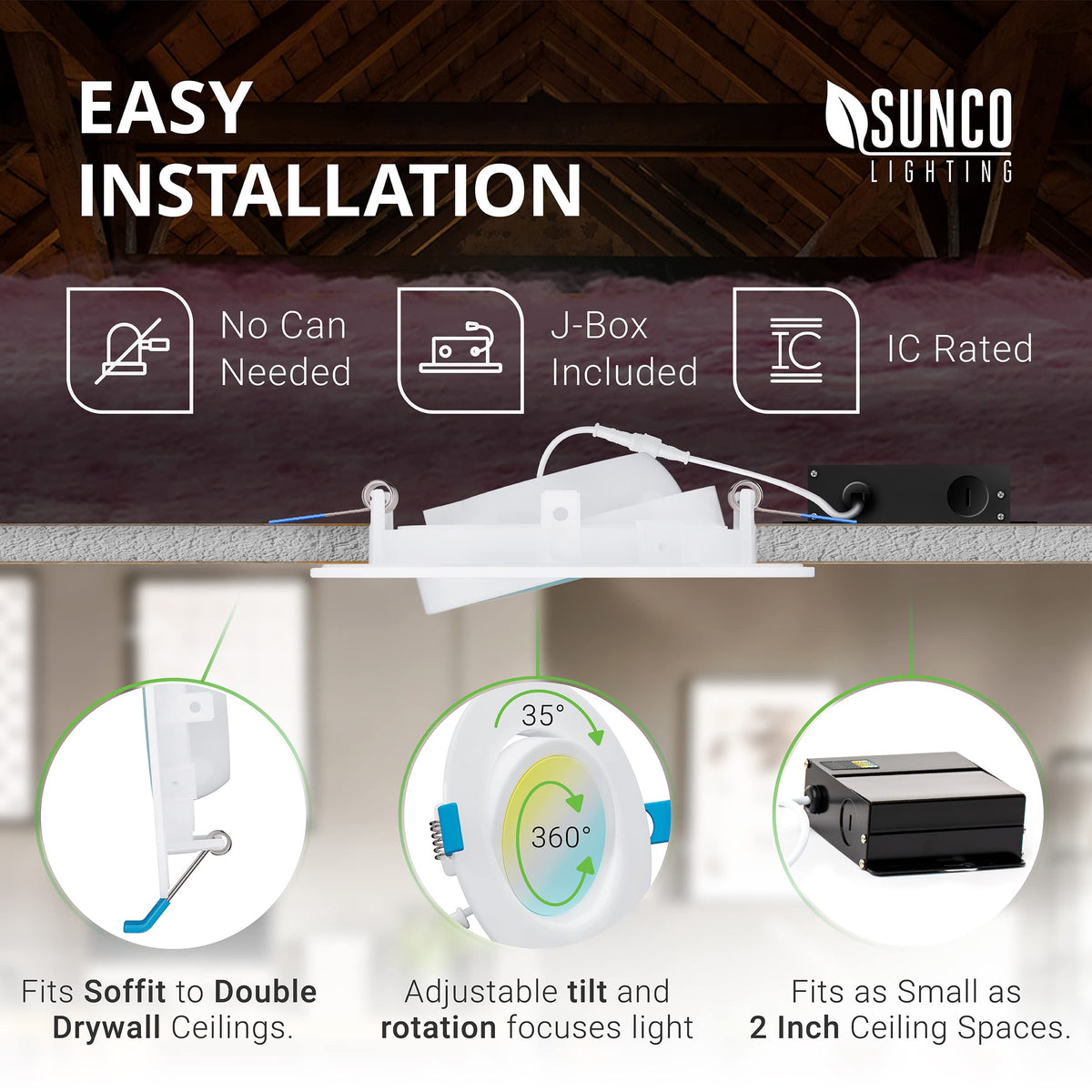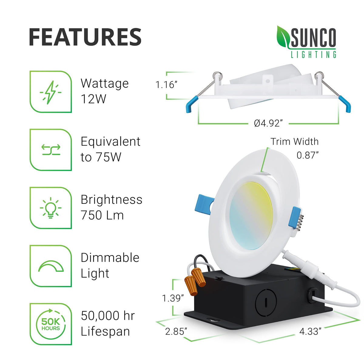 Q: What are the benefits of using Sunco Recessed LED Lights?A: The Sunco Recessed LED Lights offer multiple benefits including energy efficiency, with a brightness equivalent to a 75W incandescent bulb while consuming only 12W. They also provide selectable color temperatures (2700K, 3000K, 3500K, 4000K, and 5000K), allowing you to customize the ambiance of your space. Additionally, their ultra-slim design makes them ideal for tight ceiling spaces.