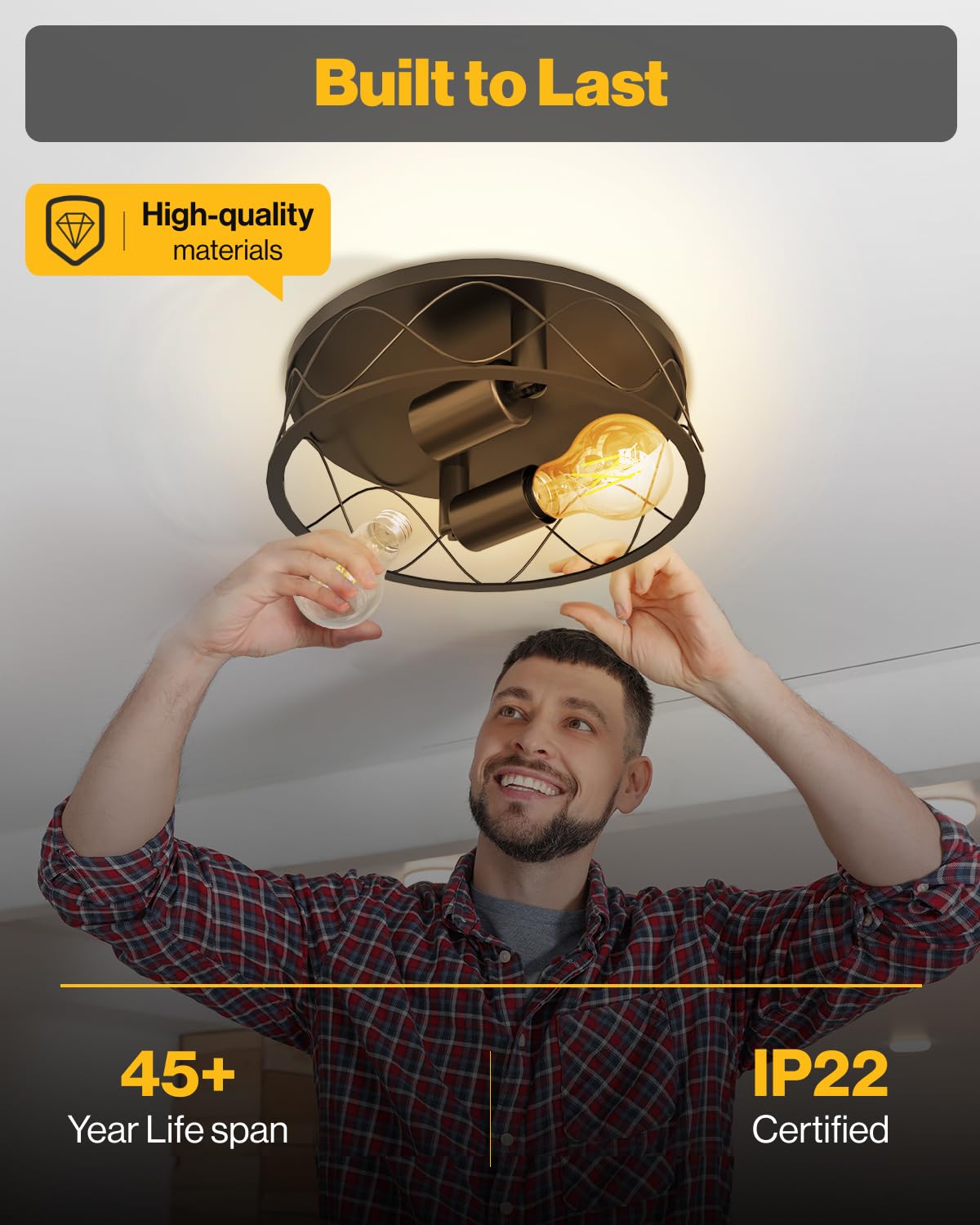The Villa Farmhouse Ceiling Light features a matte black finish that creates a timeless statement in any room. Made from durable materials, including cold rolled sheet metal and smooth iron wire, this fixture is built to last. Its anti-corrosive finish ensures longevity, while the steel caged design encases dual lamp sockets to provide ample illumination across a wide area. This ceiling light is perfect for entryways, hallways, kitchens, bathrooms, bedrooms, living rooms, or modern office spaces.