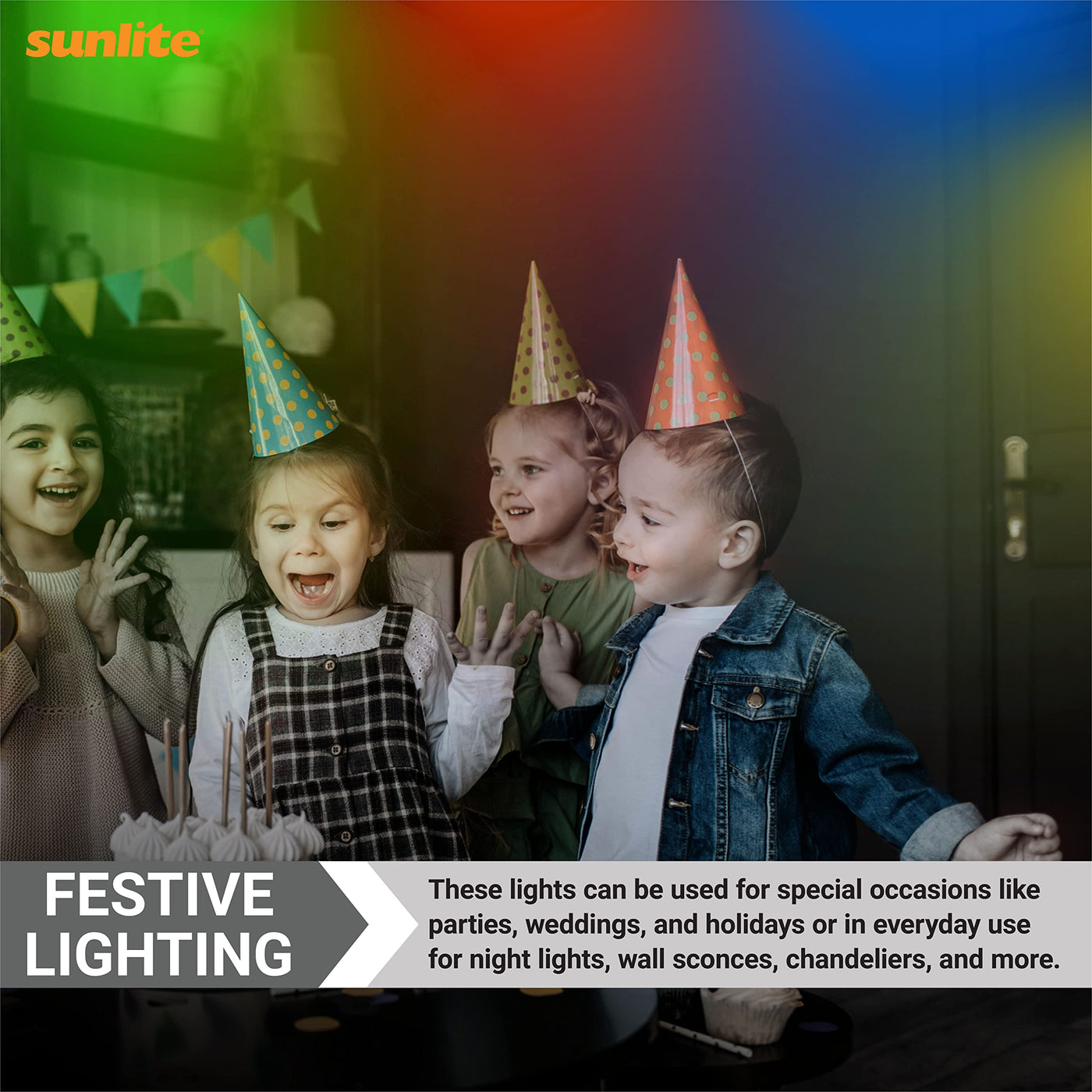 Sunlite lighting 12 pack classic incandescent petite C7 lamps deliver a beautiful beam of crystal clear light to any setting while only utilizing 7W of energy to produce a comfortable colored light. Ideal for a wide range of settings in part to not containing the hazardous chemical, mercury. Featuring a candelabra (E12) base, these lamps were meticulously designed to fit in a variety of applications. With an average lamp life of 2000 hours, these colored C7 light bulbs will add a great colorful and fun look to your home