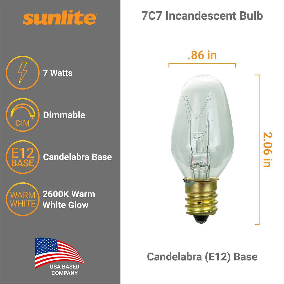 Sunlite 01280 7C7 Incandescent Bulb, 7 Watt, Candelabra E12 Base, C7 Small Night Light, Colored Bulb, Clear, 25 Count