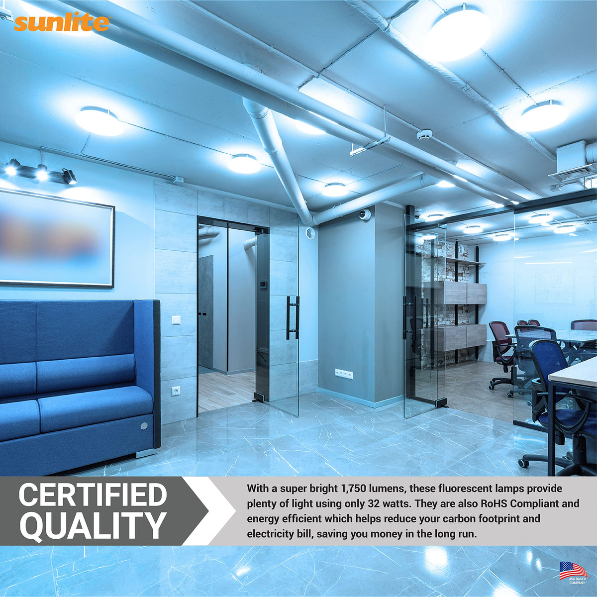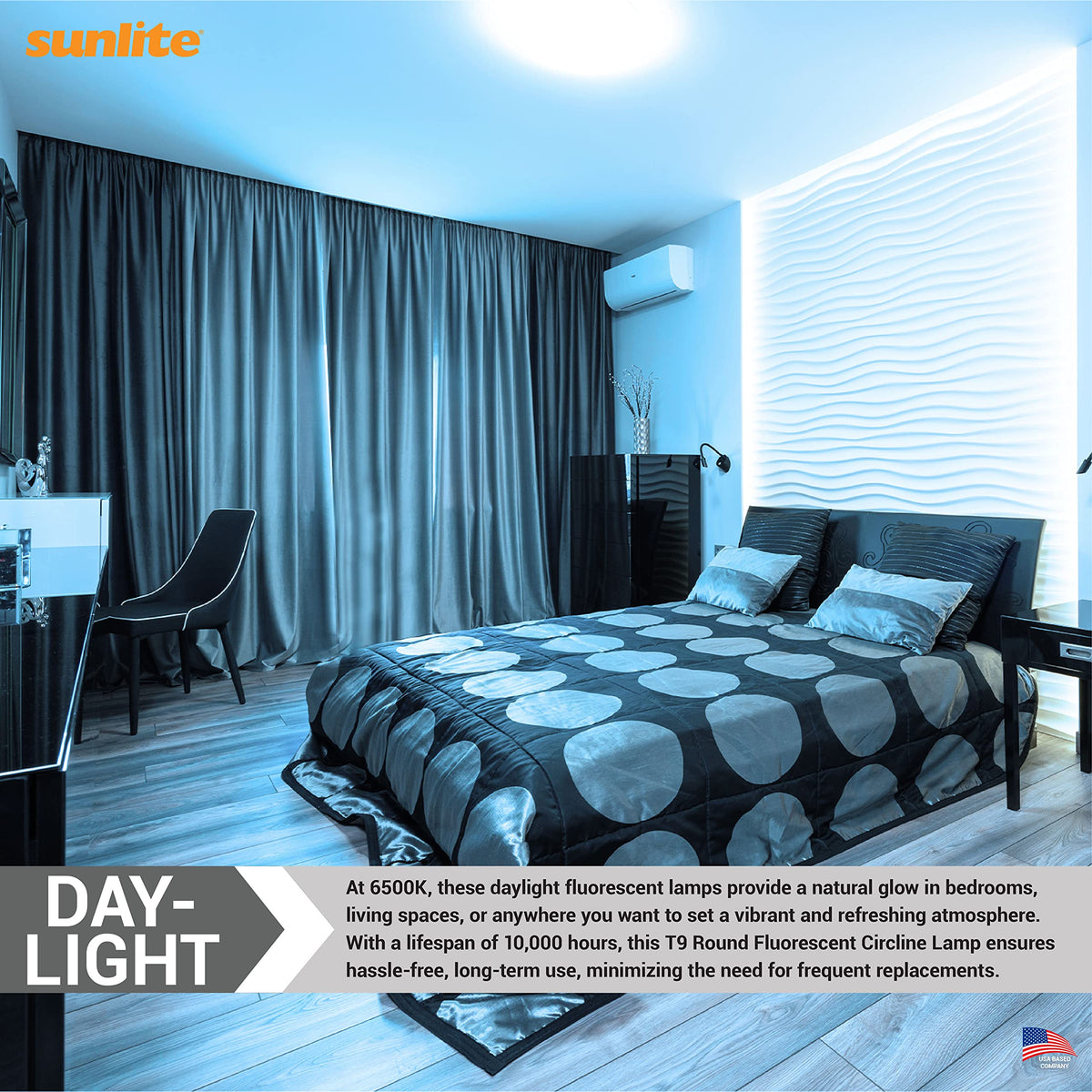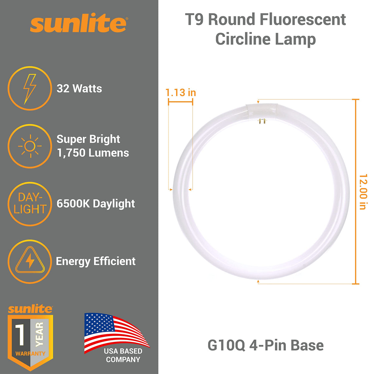 Sunlites T9 Round Fluorescent Circline Lamp is an energy-efficient, cost-effective lighting solution with a long lifespan of 10,000 hours. Consuming only 32 watts of power, this 1750-lumen lamp reduces your carbon footprint and electricity bill while providing bright and consistent illumination. The G10Q 4-pin base allows for easy installation, and the 6500K daylight creates a natural ambiance in living spaces. RoHS compliant and environmentally friendly, perfect for both home and workspace use. Dimensions 12 W x 1.13 H x 12 D.