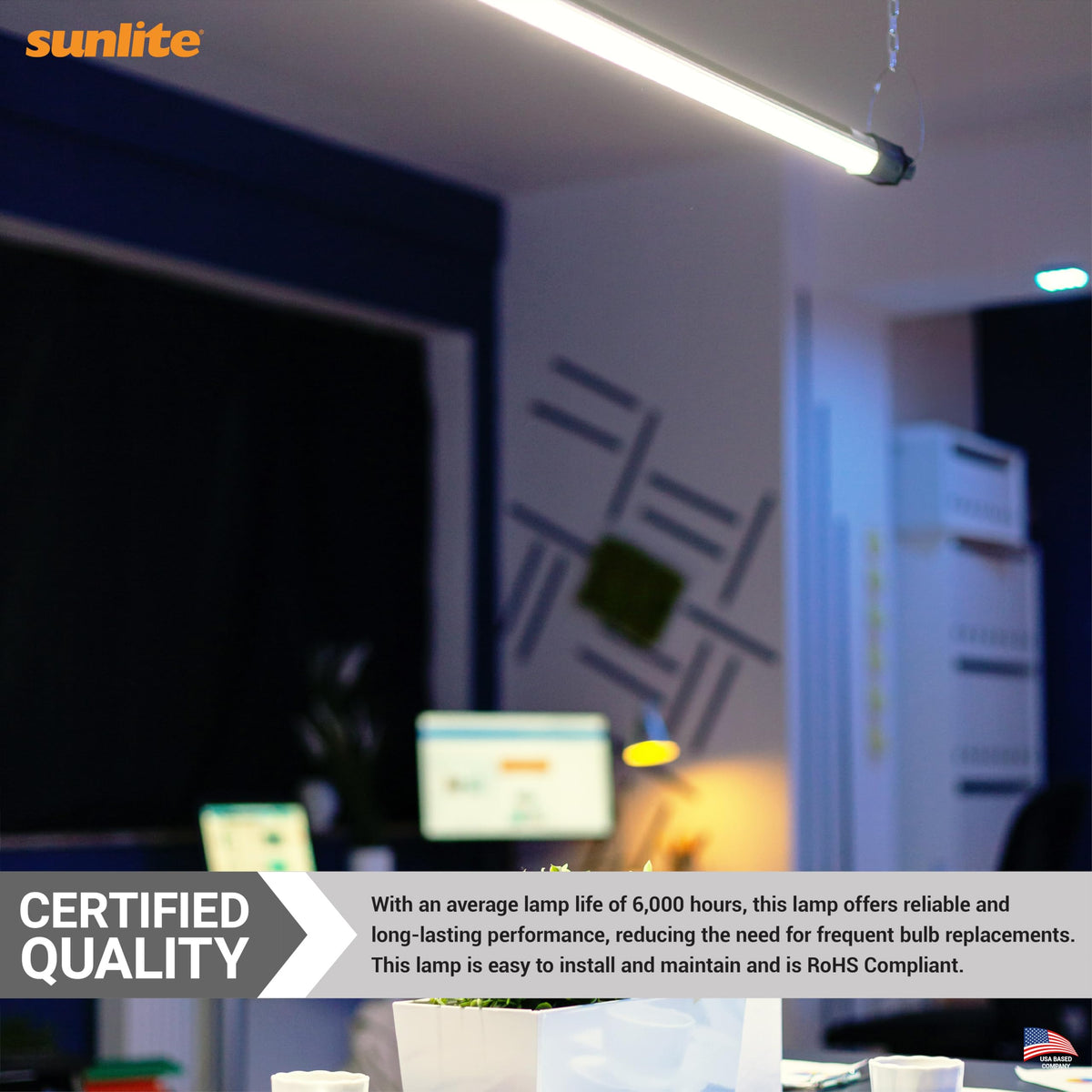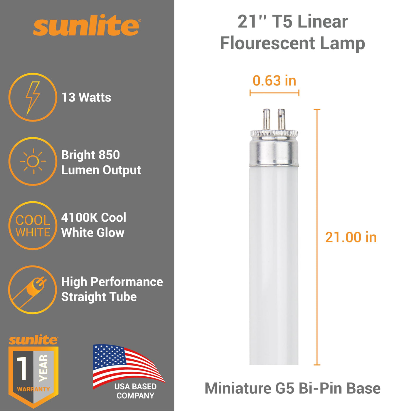 Sunlite T5 Linear Fluorescent Lamp is a high-performance lighting solution that boasts impressive efficiency and longevity. With a brightness of 850 lumens and using just 13 watts of energy, this lamp is a cost-effective and environmentally friendly choice. At 4100K these cool white bulbs provide a cool glow in bedrooms, living spaces or anywhere you want to set a bright mood in any environment. With an average lifespan of 6,000 hours, this lamp is a reliable and long-lasting lighting solution, reducing the need for frequent bulb replacements. Its versatile design makes it suitable for a wide range of applications, from replacing a single bulb to outfitting an entire building. This fluorescent lamp is easy to install and maintain, saving you time and hassle. Lamp Dimensions: 0.63 W x 0.63 H x 21 D.
