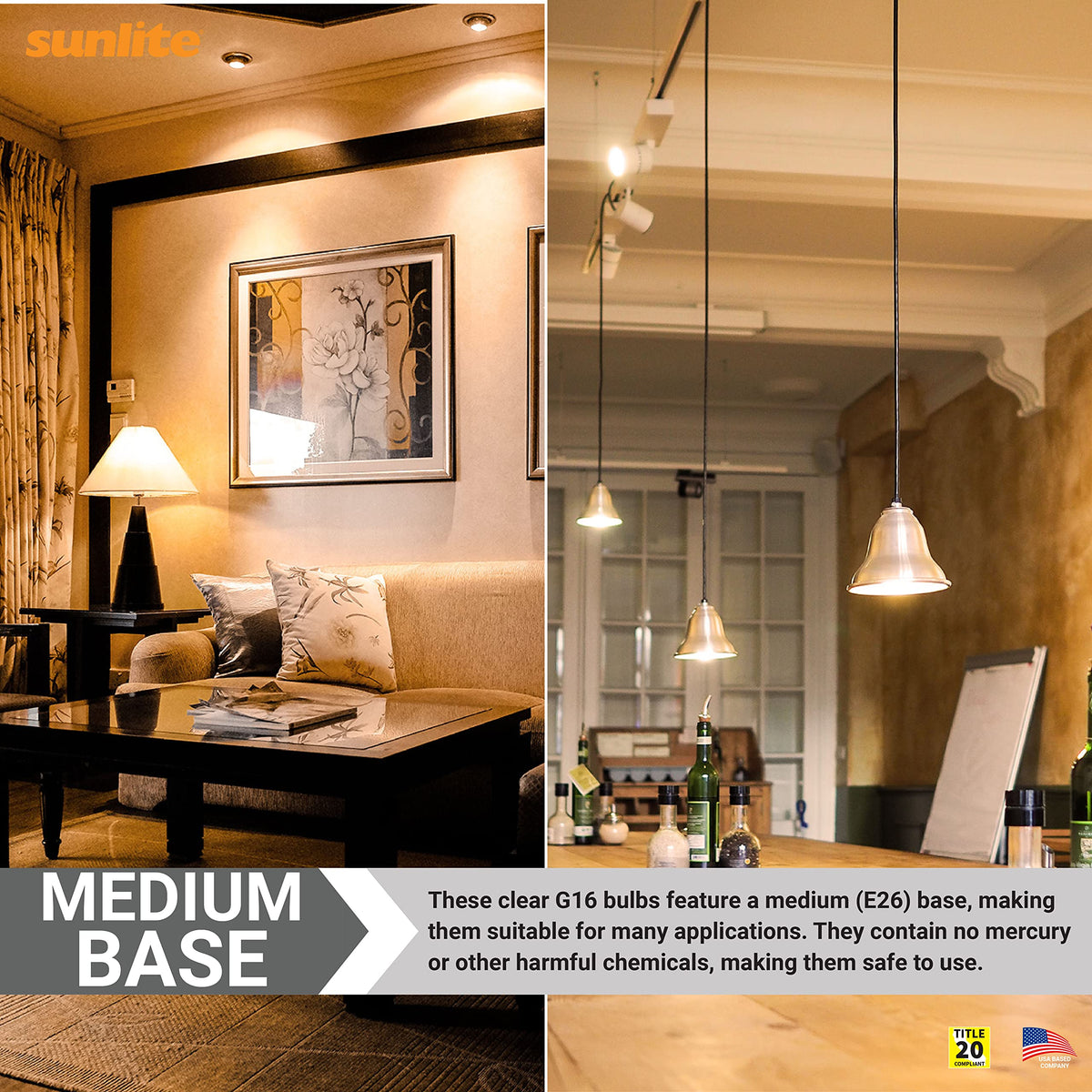 Sunlite 40137 G16 Globe Incandescent Light Bulbs, 25 Watts, Medium Base (E26), 120 Volt, Dimmable, 150 Lumens, Title 20 Approved