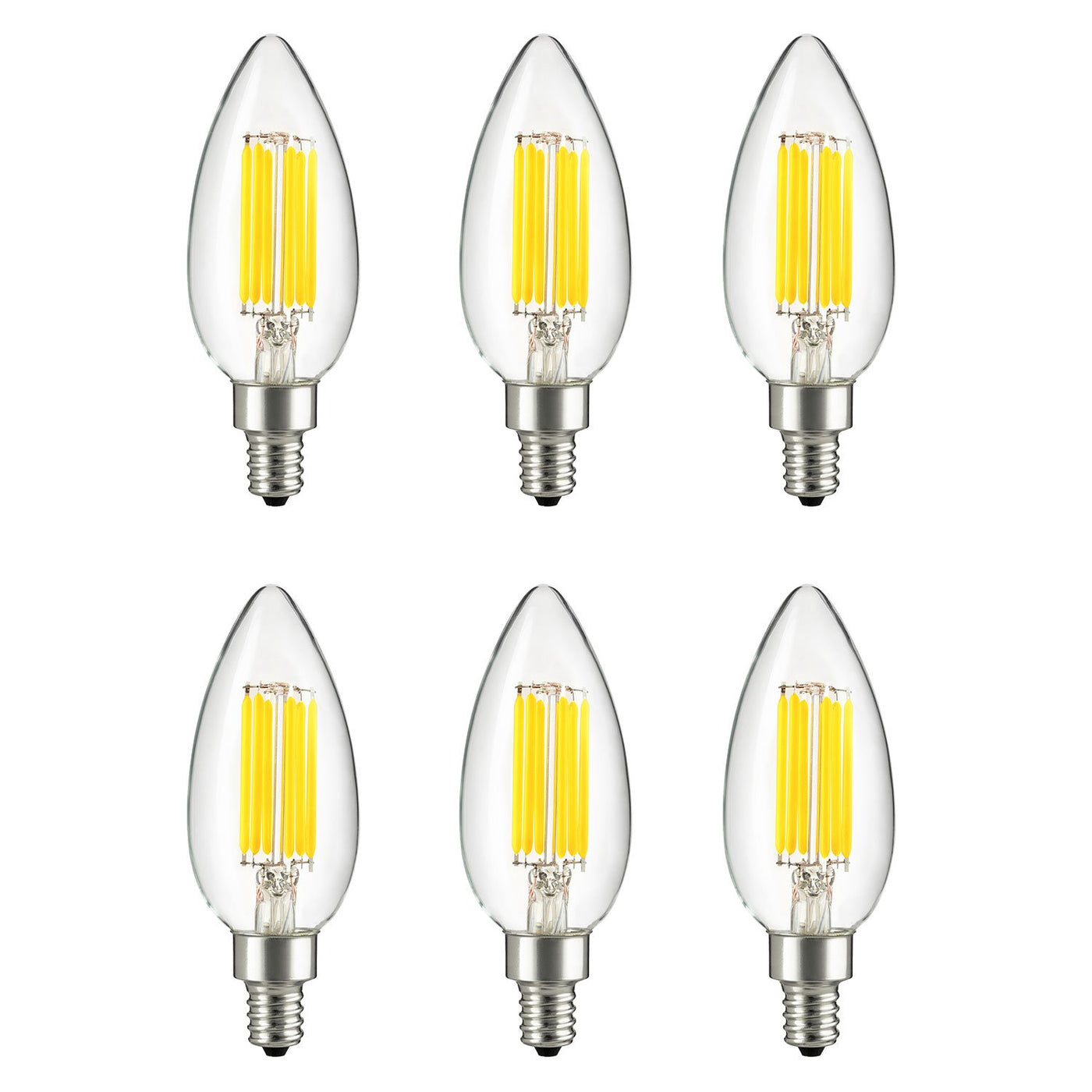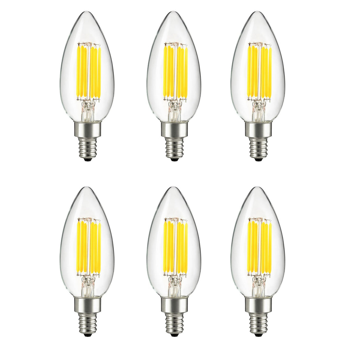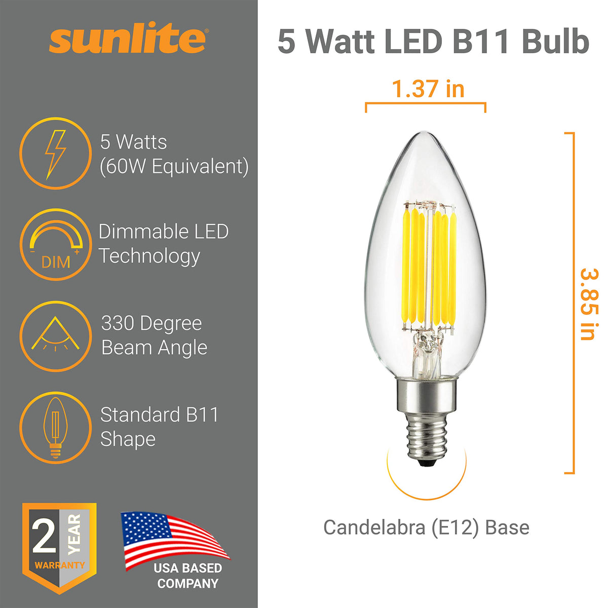 The Sunlite Led B11 Filament Style Chandelier Light Bulbs, Are An Energy Efficient, Long Life Replacement For Incandescent Bulbs In Decorative Fixtures. These Dimmable Bulbs Put Out At Much Light As A 60 Watts Bulb While Only Using 6 Watts Of Electricity. Long 15, 000 Hours Life Span Means You'Ll Save Money And Replace Difficult To Reach Bulbs Less Often. They Have A 600 Lumens Output. Color Rendering Index (Cri) Of 80. Candelabra Base (E12) Compatible With A Variety Of Decorative Applications Such As Chandeliers, Wall Sconces And Ornamental Lights. Annual Operating Costs Of $0. 60 A Year Based On 3 Hours A Day Use At $0. 11/Kwh. This Vintage Light Bulbs Are Ul Listed For Safety And Quality. Bulb Measures 5.29 Inches In Overall Height And 2.79 Inches In Diameter. This Product Has A Two-Years Warranty.