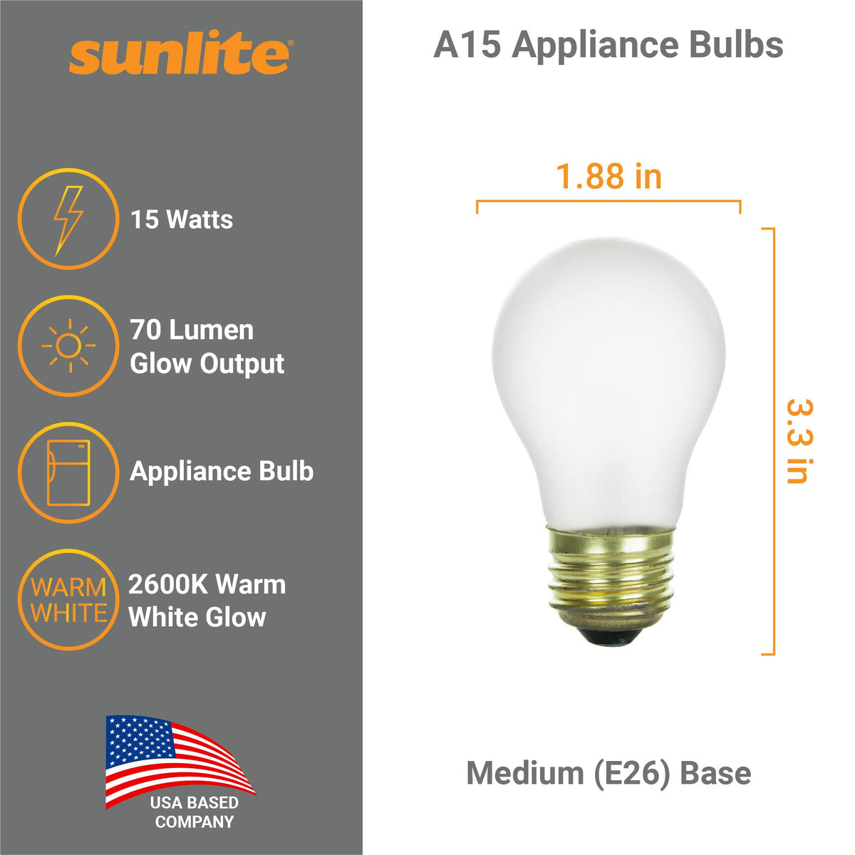 Sunlite 41622 Incandescent Appliance A15 Light Bulb, 15 Watts, 70 Lumens, Medium Base (E26), Dimmable, Mercury Free, 2600K Warm