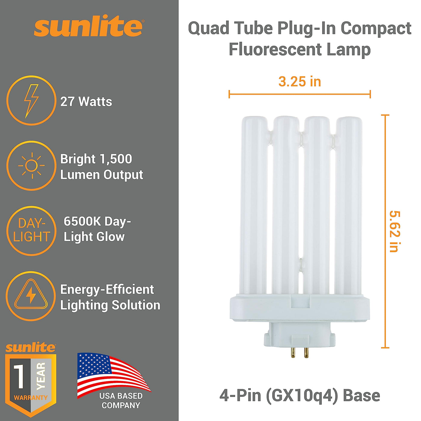 Upgrade your lighting setup with Suniltes Quad Tube Compact Fluorescent Lamp. With 1500 lumens of brightness, this lamp provides plenty of light using just 27 watts of energy, making it a cost-effective lighting solution. Estimated yearly energy cost is a low $3.25 (Based on 3 hours/day use at $0.11/kWh). With an average lamp life of 10,000 hours, this lamp offers reliable and long-lasting performance. 6500K color temperature and daylight color. This quad tube lamp is easy to install and maintain, saving you time and no hassle. Its GX10q4 base ensures compatibility with a variety of installations. Dimensions 0.9 W x 5.75 H x 0 D.