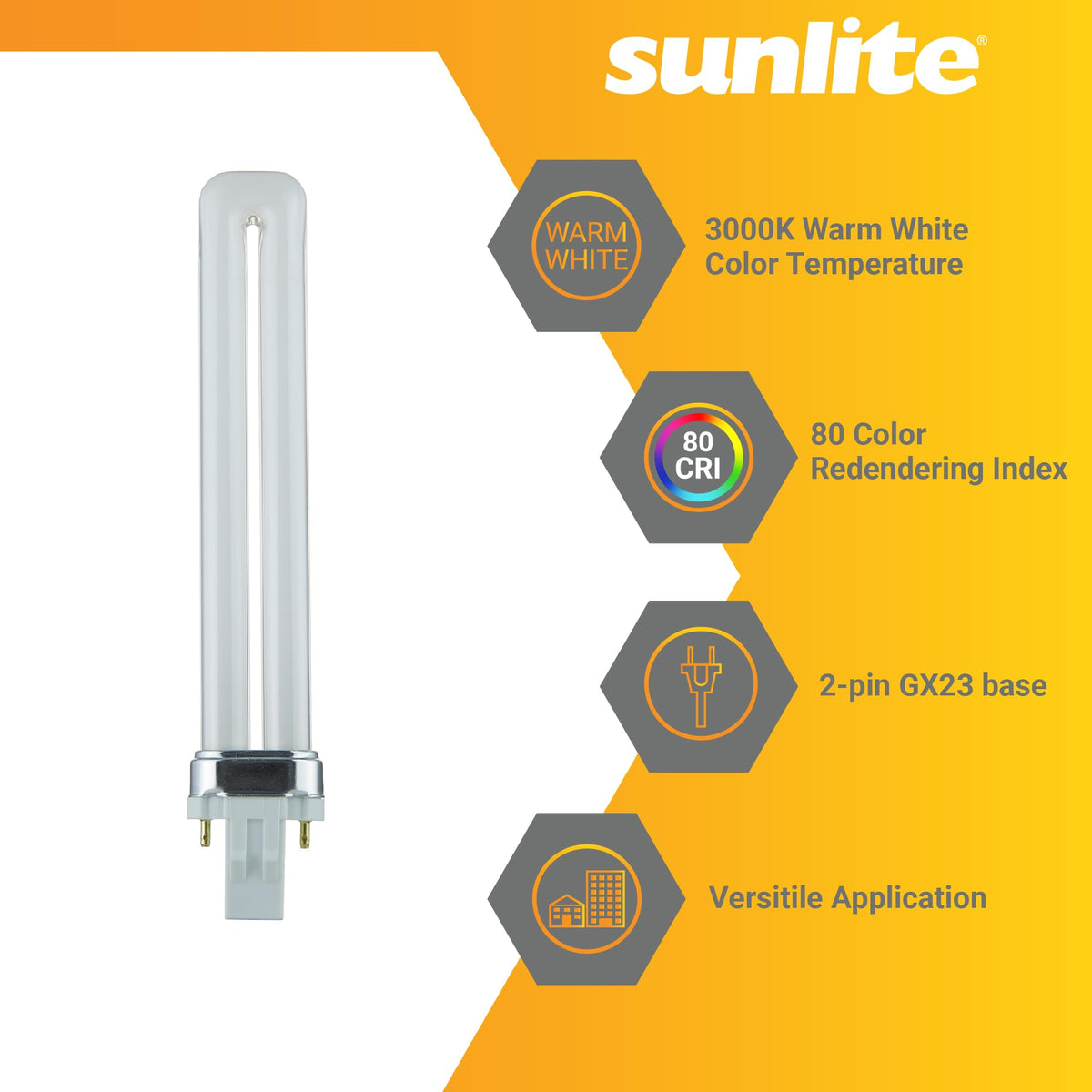 Sunlite Compact Fluorescent Single U-Shaped Twin Tube Light Bulb is an energy-efficient lighting solution designed to deliver bright, cool white illumination. With a 13-watt power output and a 720-lumen brightness level, this bulb provides ample light while saving on energy costs. Operating at 120 volts, it features a convenient 2-pin GX23 base for quick installation and secure fitting. This bulb offers long-lasting performance and consistency for all your lighting needs.
