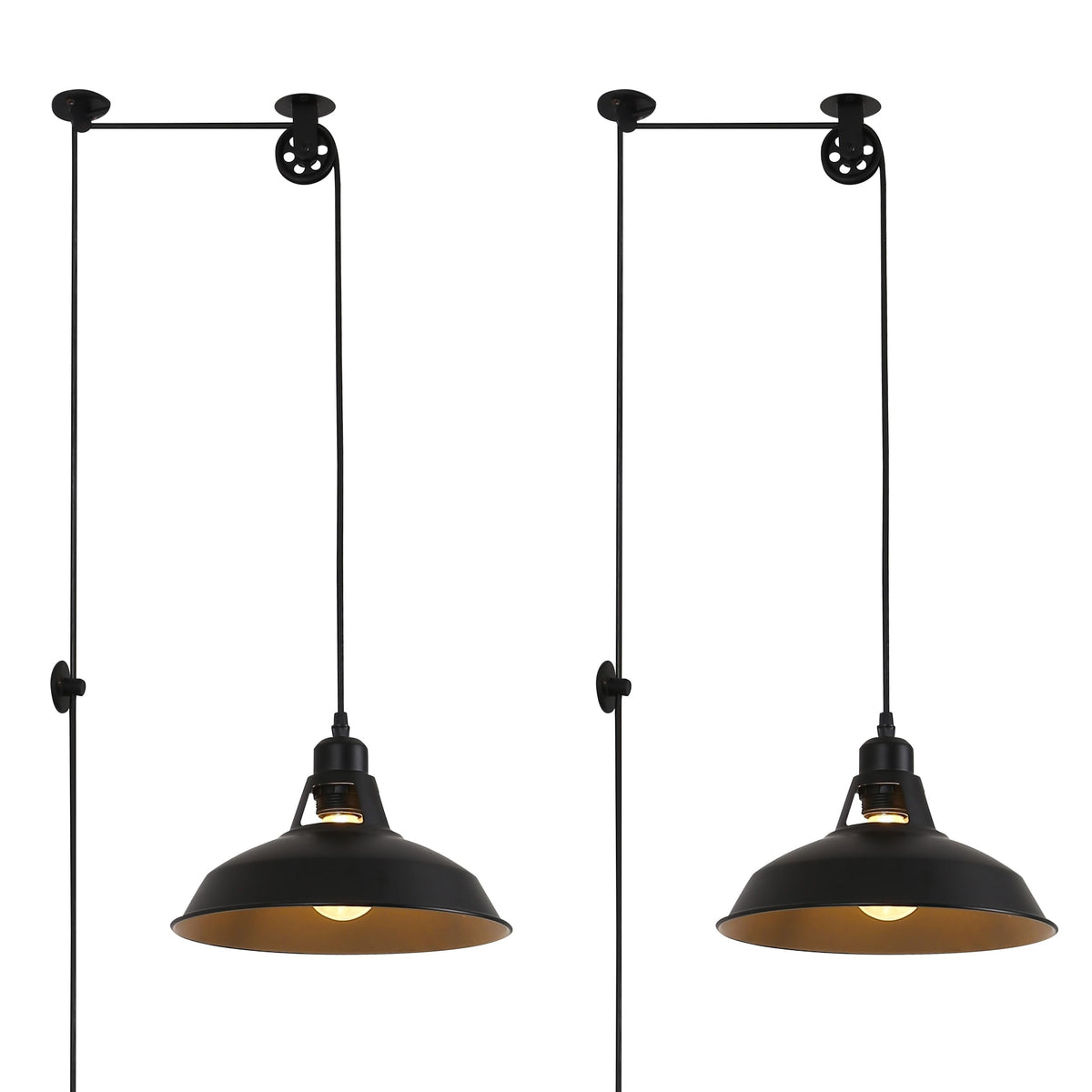 Sunllok Industrial 2Pcs Pendant Light Lift Pipe Pulley Ceiling Fixture - Rustic Retro Adjustable Height Plug In Hanging Lamp With Switch - Indoor Metal Chandelier For Living Room Restaurant (Black)