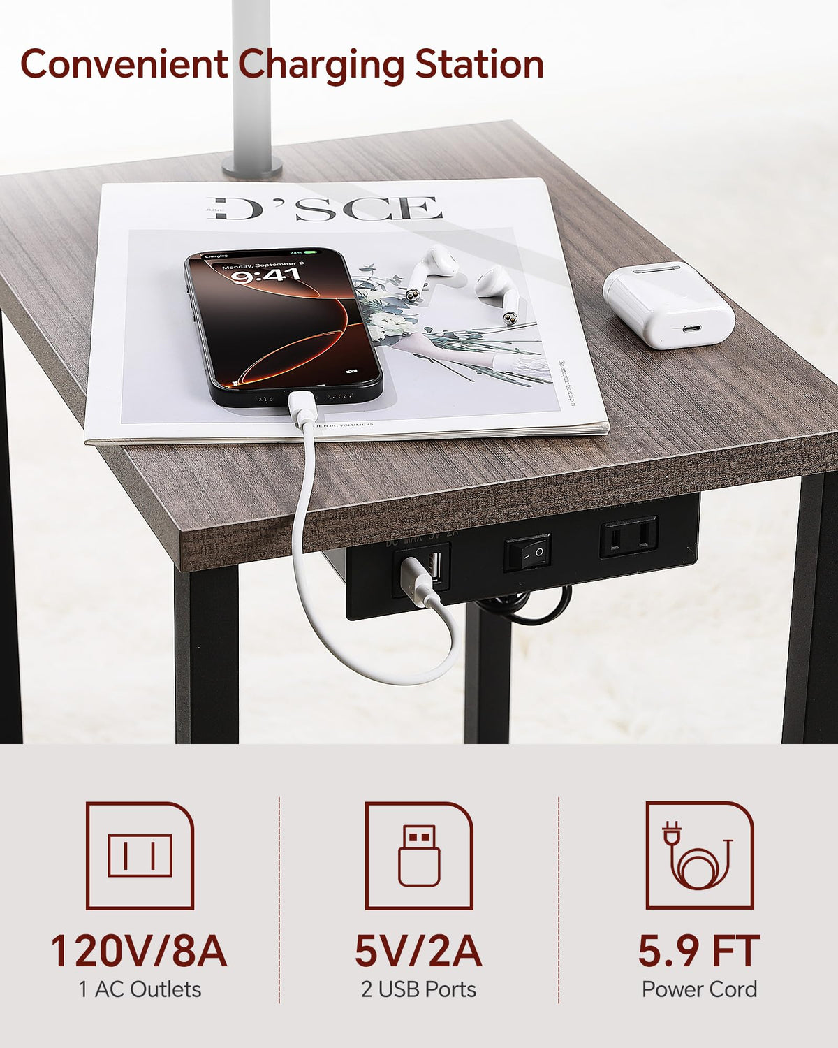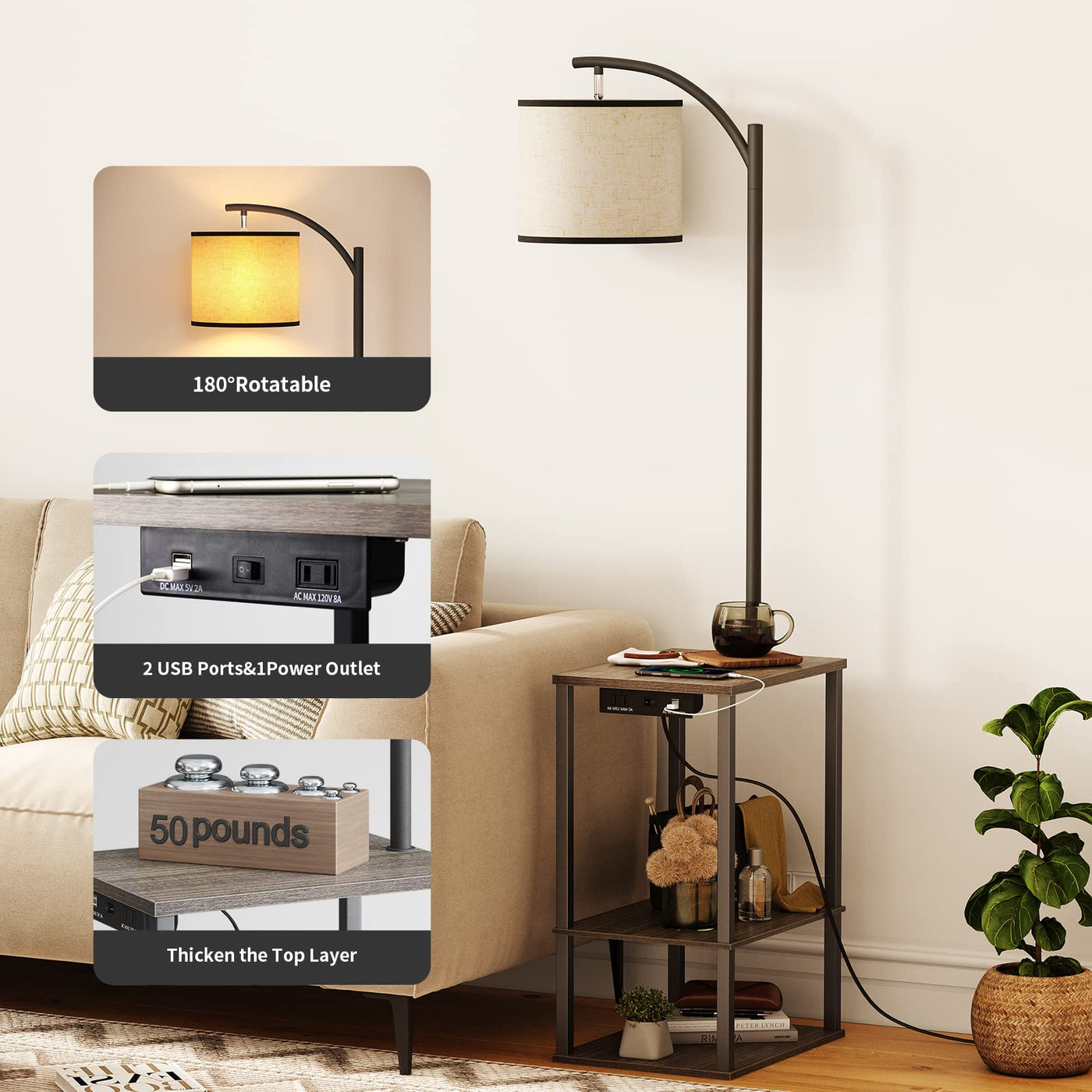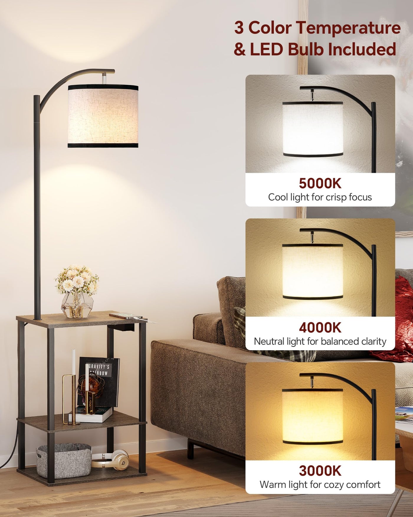 SUNMORY table with lamp is composed of a coffee table with 3 shelves and 1 arc lamp. Equipped with a 3-color temperature bulbs with E26 base, 2 USB charging ports, 1 power socket, and the angle of the lamp head can be adjusted. Suitable for reading, working, and studying in the living room, bedroom, office.