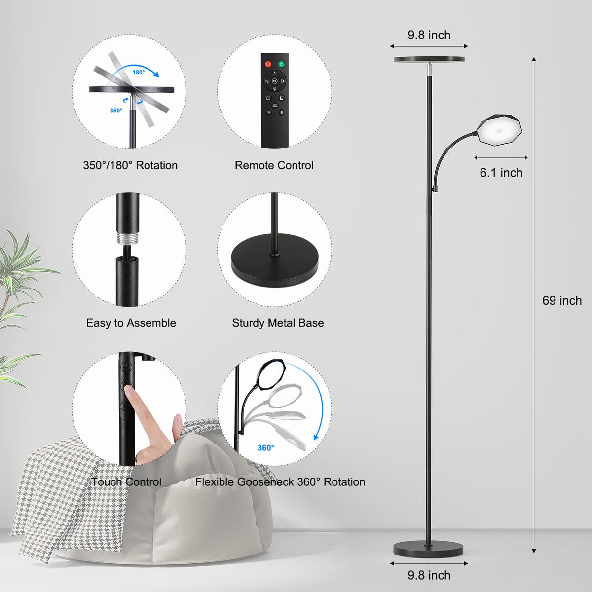 SUNMORY Floor Lamps for Living Room, 32W/3000LM Super Bright LED Floor Lamp with Remote Control, 69'' Tall Standing Lamp with Stepless Dimmable, Modern Torchiere Reading Lamp for Bedroom, Office