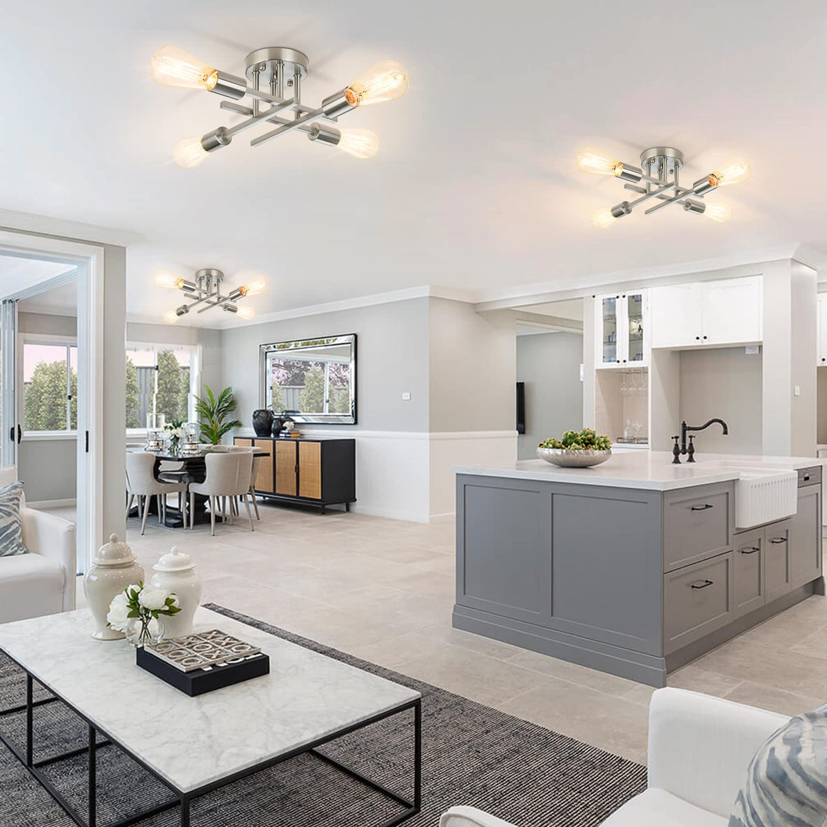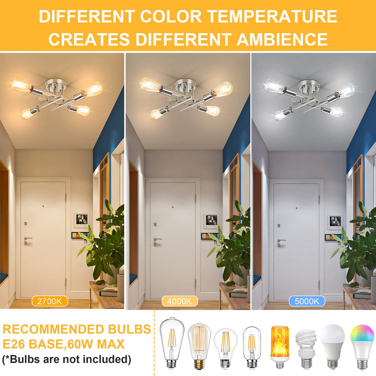 Introductions: Semi Flush Mount 4 Light Ceiling Lights Specifications: Voltage: 110-120V Wattage: Max 60W Per Socket Frequency: 60Hz Material: Metal Style: Classic/Modern/Industrial Power Source: Corded-Electric Installation Way: Ceiling Mount Bulbs Not Included Recommended Bulbs: E26 Base Socket Is Compatible With Various Bulbs, Such As Led, Incandescent, Cfl. Recommended Edison Bulbs(Bulb Not Included). Takes 4 Maximum 60 Watt E26 Medium Base Bulbs (Not Included). Recommended Applications: Bathroom, Kitchen, Basement, Hotel, Powder Room, Restaurant, Bedroom, Study Room, Farmhouse, Living Room, Workshop, Shop, Office, Hallway, Entryway, Porch, Balcony, Stair, Window, Tv Side, Bar, Cafe, Foyer, Mudroom, Guest Room, Galley Package Includes 2 X 4-Light Ceiling Light Fixture 2 X Tool Kit 1 X User Manual Notice: Cut Off Power Before Installing Or Cleaning The Light. The Light Supports Up To 60 Watts Maximum Per Socket. Do Not Put The Wall Sconce In Overheating Working Condition Or Cast It Into The Fire. Do Not Retrofit The Product, The Bulb Does Not Be Included.