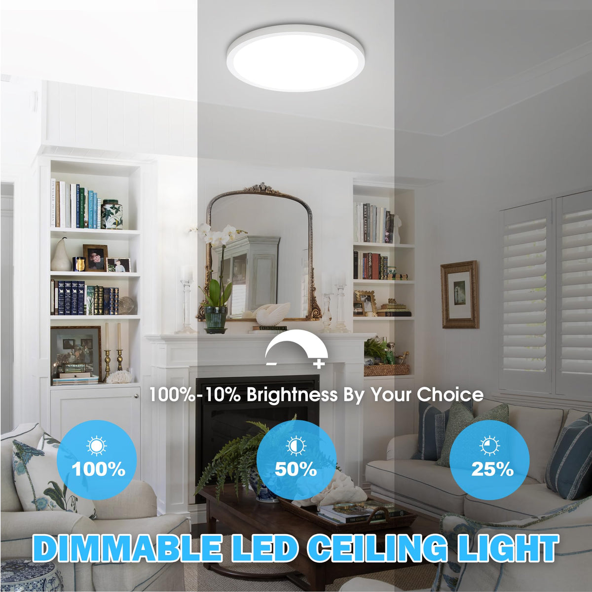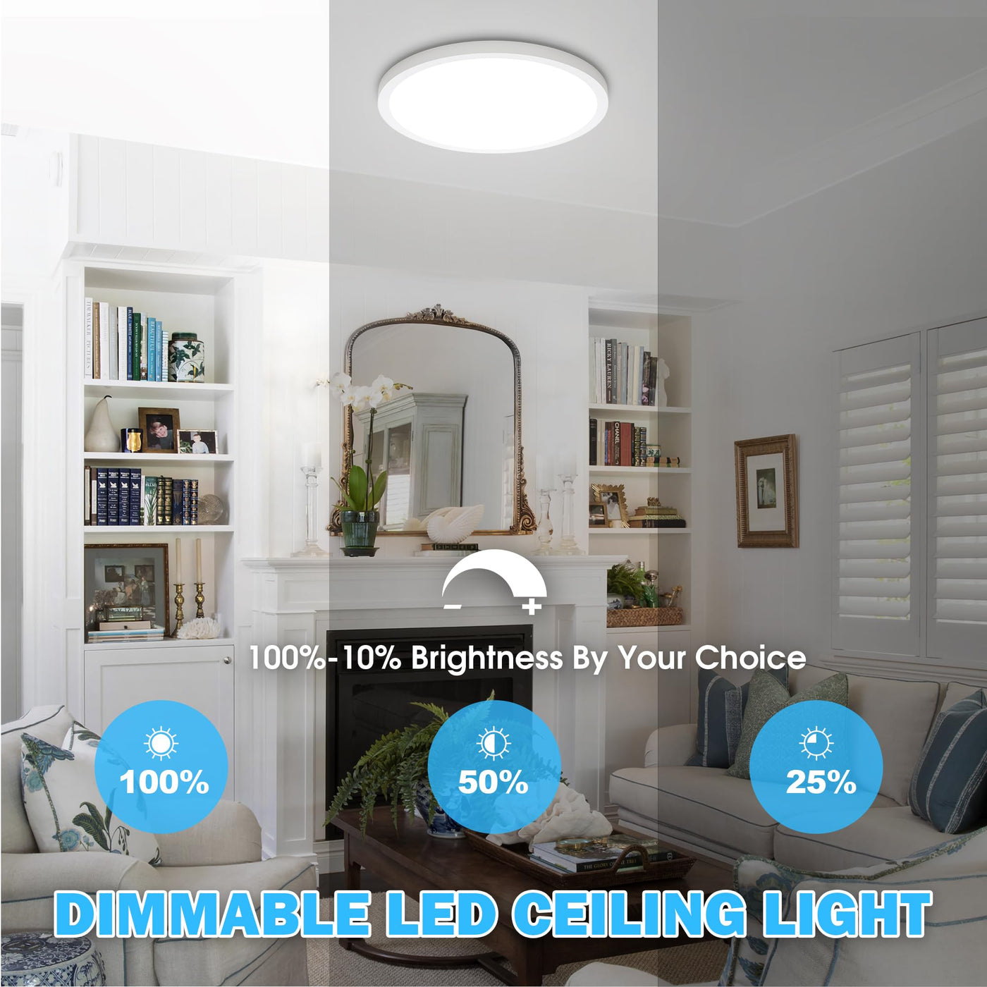 Introductions: 24W LED Flush Mount Ceiling Light Fixture, 12 Inch 2100LM 5000K Daylight White Modern Close to Ceiling Light, Dimmable Ultra-Thin Flat Round Indoor Lighting Lamp for Living Room Bedroom Kitchen Specifications: Dimmable: No Diameters: 12 Inch Thickness: 0.71 Inch Shape: Round Flat Light Color: 5000K Daylight White Shade Color: White Wattage: 24W Equiv. Wattage: 240W Brightness: 2400LM(Highest Brightness) Voltage: 110-130V Wattage:24W Frequency: 60Hz Beam Angle: 120? Color Rendering Index: 85+ Lifespan: 50000 Hours+ Waterproof: IP20 Number of LED Bead: 135 LEDs Style: Classic/Modern Power Source: Corded-electric Installation Way: Ceiling Mount Features: Long Lifespan, High Brightness, Slim, Ultra Thin, High CRI, Energy Saving, No Flicker, Nontoxic, Not Dimmable, Stable Light, Easy to Clean, Dust proof, Durable, Resistant to Corrosion Recommended Applications: Bathroom, Kitchen, Basement, Hotel, Powder Room, Restaurant, Bedroom, Study Room, Farmhouse, Living Room, Mudroom, Guest Room, Galley, Dining Room, Kids Room, Nursery, Utility Room, Home Office, Workshop, Shop, Office, Hallway, Entryway, Porch, Balcony, Bar, Cafe, Foyer, Mudroom, Guest Room, Galley, Attic, Basement, Garage, Staircase, Stairwell Installation Steps: 1. Fix the bracket into the ceiling with screws. 2. Connect the wires separately. 3. Install the light into the bracket, aligning the holes. 4. Fix the light with 4 locking buckles. Package Included: LED Ceiling Light Fixture 1 x Tool Kit 1 x User Manual Notice: Cut off power before installing or cleaning the light. Do not put the light in overheating working condition or cast it into the fire. Do not retrofit the product, the bulb does not be included.